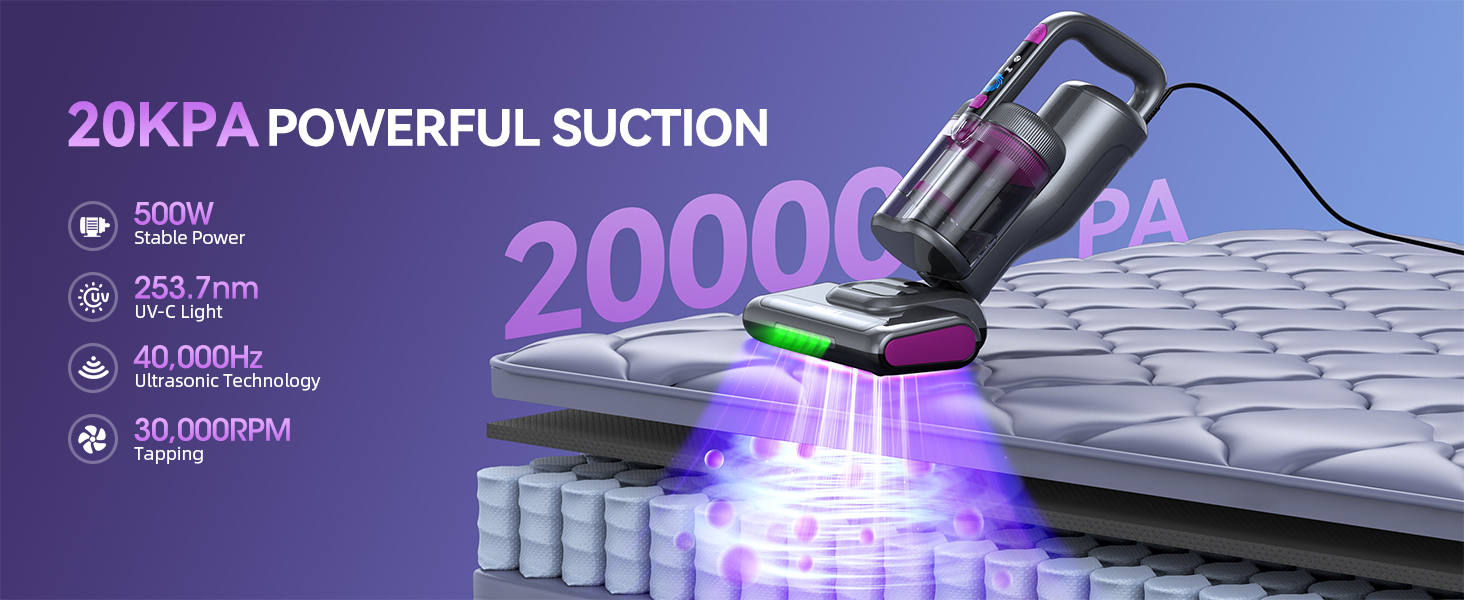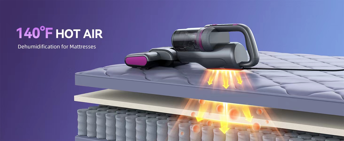 【تنظيف عميق من المصدر】اذهب إلى ما هو أبعد من تنظيف الأسطح باستخدام مكنسة المرتبة عالية الأداء. تم تصميمه بمحرك قوي بقدرة 500 واط، ويوفر 20 كيلو باسكال من الشفط القوي الذي يعمل جنبًا إلى جنب مع فرشاة عالية السرعة تبلغ 30000 دورة في الدقيقة، ونقر قوي للدخول إلى المراتب والأرائك والأقمشة ورفع الغبار والوبر. يساعد نظام الهواء الساخن المتكامل 140 درجة فهرنهايت على تجفيف المرتبة، ومنع الرطوبة وتعزيز بيئة نوم أكثر نضارة وصحة.