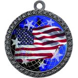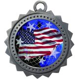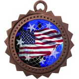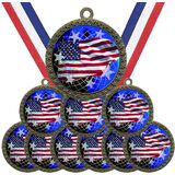 10 عبوات من المعدن المصبوب بقطر 6.35 سم من جوائز العلم الأمريكي بالولايات المتحدة الأمريكية. تشتمل كل ميدالية على شريط رقبة أحمر وأبيض وأزرق بعرض 7/8 بوصة لعرض ميدالية الجائزة بفخر