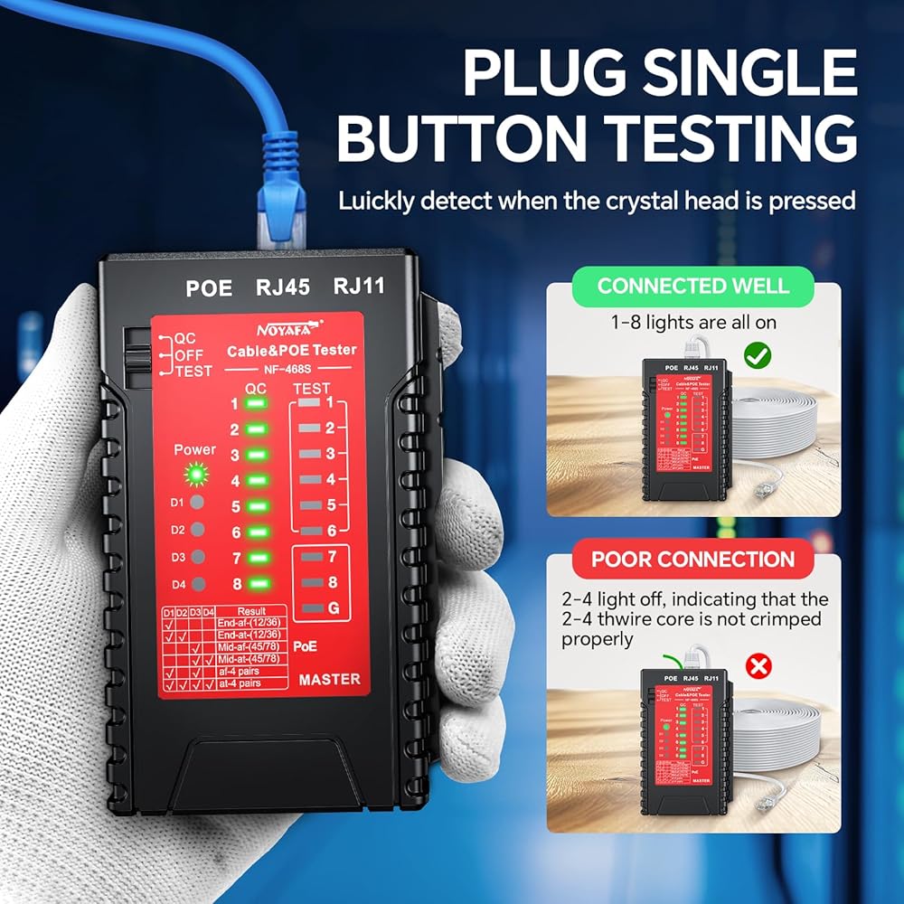 UTP/STP TESTING: Indicator lights on the connected port in the device flash to help locate cables accurately. quickly detect the crimping condition of the crystal head, Shielded network cable can also be used(UTP/STP)