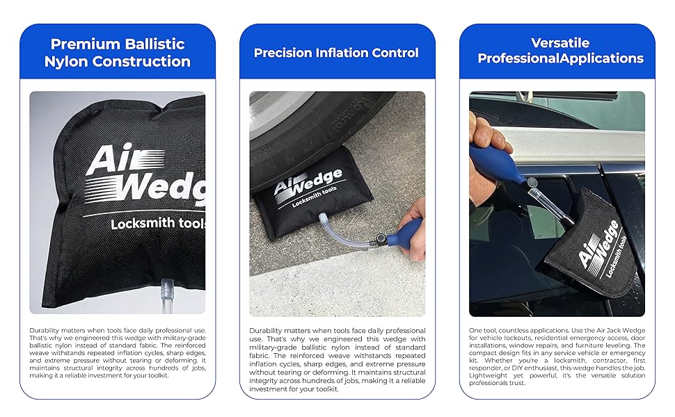 متانة شديدة التحمل: مصنوع من النايلون الباليستي الفاخر، تم تصميم إسفين الهواء هذا ليتحمل التضخم المتكرر والضغط المستمر دون تمزق أو تمدد أو فقدان الشكل، مما يضمن أداء طويل الأمد للمشروعات الاحترافية والمنزلية.