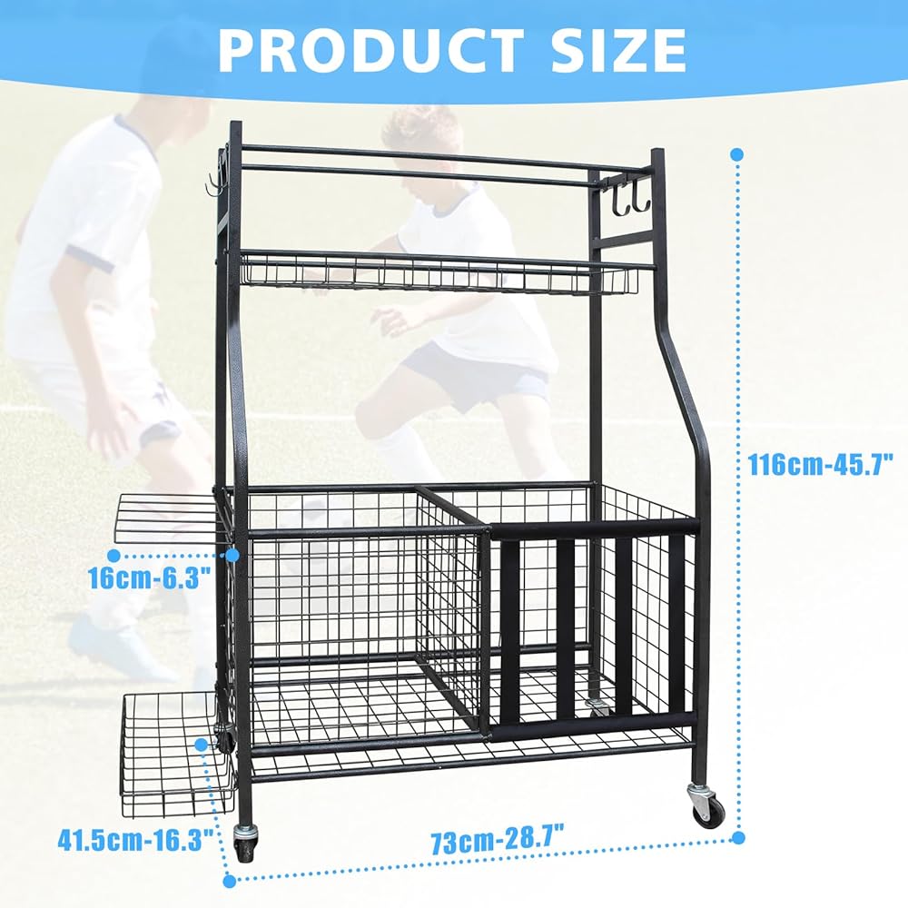 【Multi-functional Storage Rack】 1. Dedicated baseball bat holder: stable anti-tilt side design with extended slots; 2. Top ball rack and metal mesh basket for storing small balls and kettlebells; 3. Two large-capacity storage boxes: convenient for storing basketballs, volleyballs, yoga mats, and other sports equipment; 4. Thickened anti-slip hooks: can be used to hang helmets and other items.