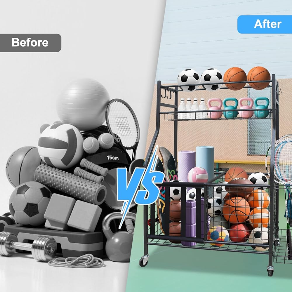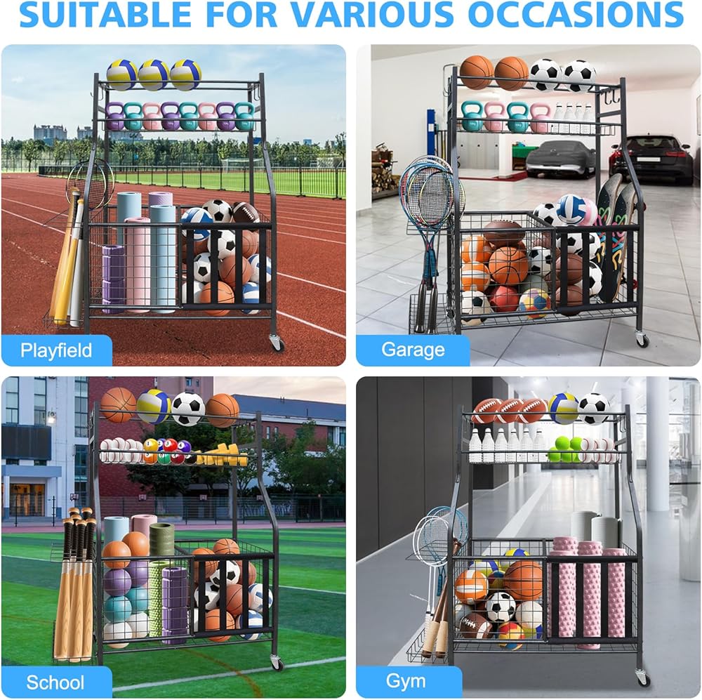 Sports Equipment Garage Organizer, Garage Ball Storage Rack with Basket, Hooks and Rolling Cart for Sports Gear and Toy Storage,Heavy Duty Ball Holder Indoor/Outdoor Use