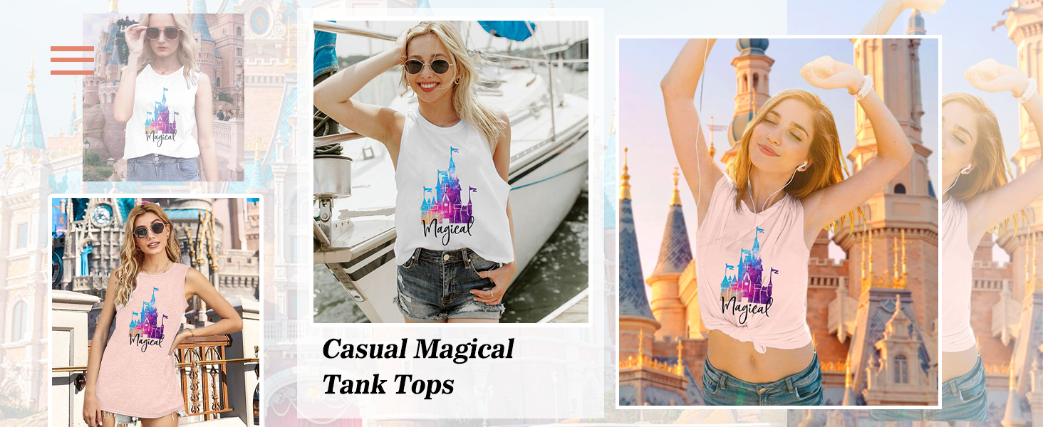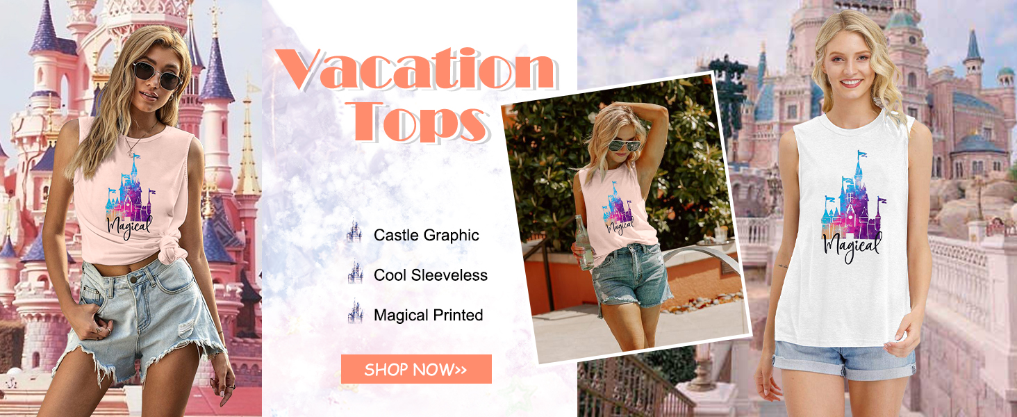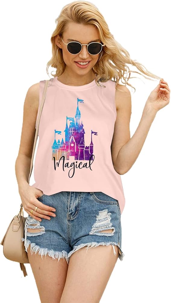 تي شيرت نسائي من Magic Castle بدون أكمام برسومات المملكة السحرية تي شيرت بناتي للرحلات كاجوال للعطلات والعطلات بدون أكمام