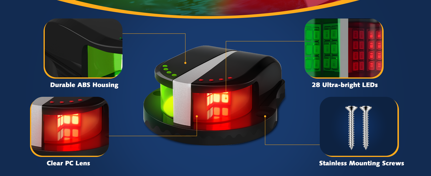 • ضوء القارب ثنائي اللون: اللون الأحمر المرئي لجانب المنفذ والأخضر للجانب الأيمن يوفر إضاءة 3NM و225 درجة، وتلبي مصابيح LED للقارب متطلبات USCG؛ بمثابة مصابيح ملاحة LED موثوقة للقارب من أجل التنقل الآمن ليلاً