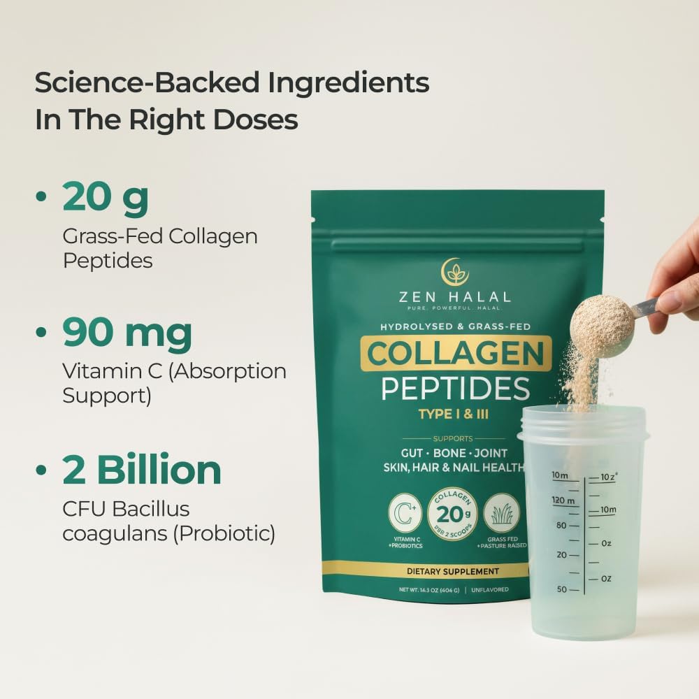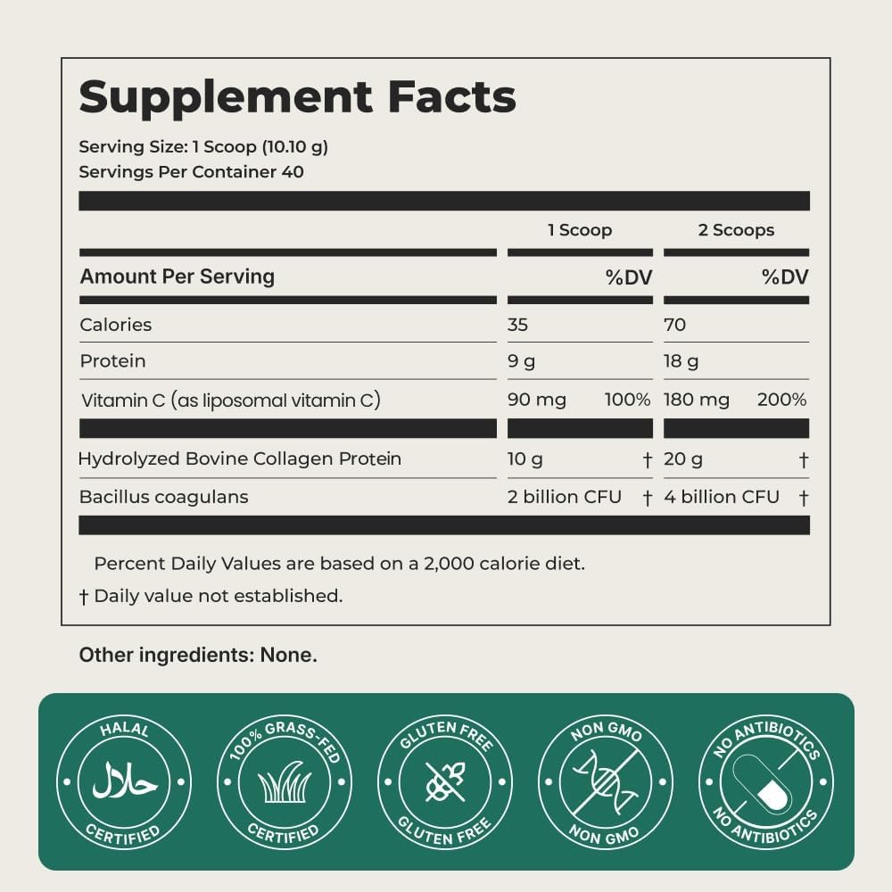 حلال حقًا، كولاجين يتغذى على العشب: ببتيدات الكولاجين البقري المحللة من الأبقار التي تتغذى على الأعشاب والمراعي، حلال معتمد من المصدر إلى الختم ويتم إنتاجه في منشأة GMP مع اختبار طرف ثالث للنقاء والفعالية.
