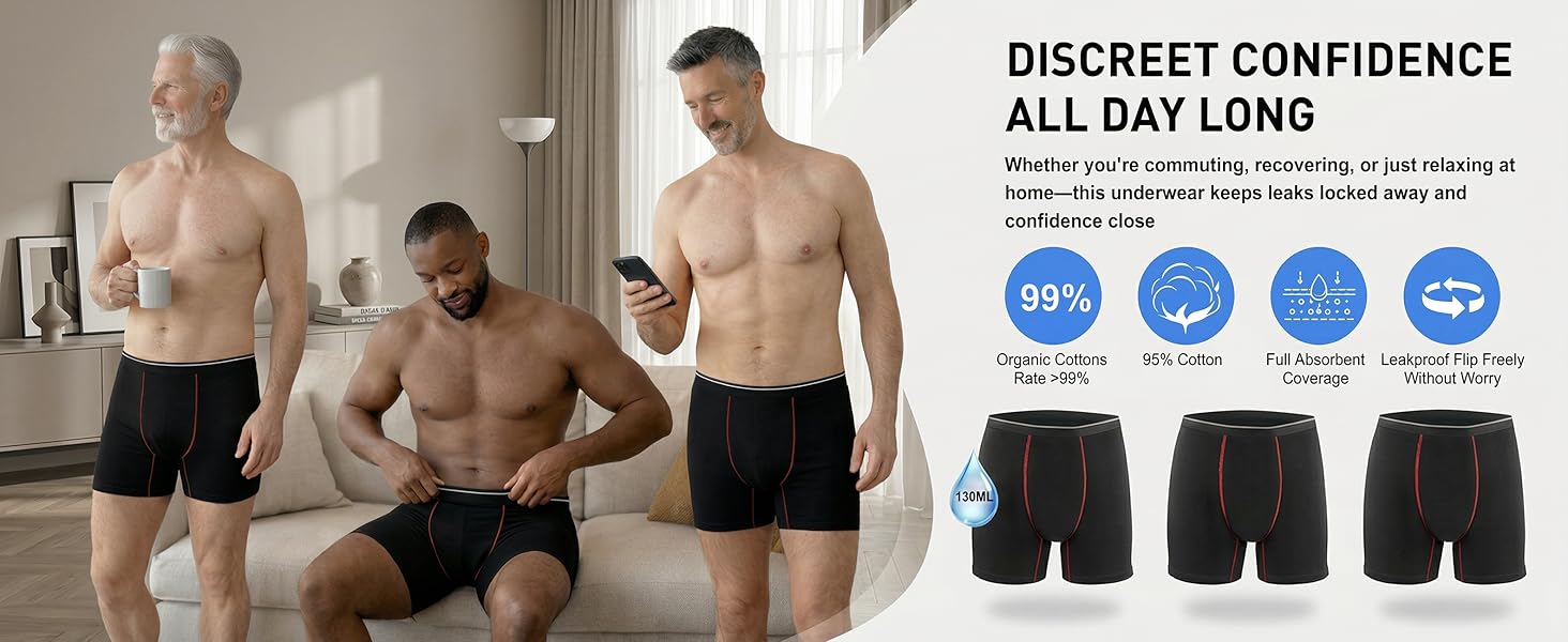 تبدو مثل الملابس الداخلية العادية: استمتع بحماية سرية دون ضجيج كبير أو انتفاخ أو تجعد. تبدو هذه الملابس الداخلية الرجالية المقاومة للسلس مثل سراويل بوكسر كلاسيكية، مما يجعلها سهلة الارتداء في المنزل أو في الرحلات أو في صالة الألعاب الرياضية أو في أي مكان تريد فيه شعورًا طبيعيًا يوميًا.