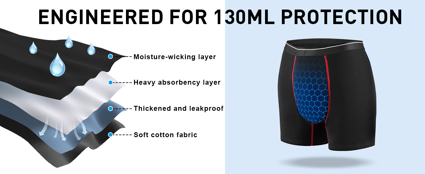 حماية من التسرب من 4 طبقات: كن أكثر ثقة أثناء العمل أو السفر أو الروتين اليومي مع الحماية المصممة لتسربات المثانة الخفيفة. تمتص هذه الملابس الداخلية للرجال المخصصة لسلس البول ما يصل إلى 130 مل وتتميز بـ 4 طبقات: بطانة ماصة، وطبقة ماصة، وحاجز مانع للتسرب، ونسيج ناعم غني بالقطن.