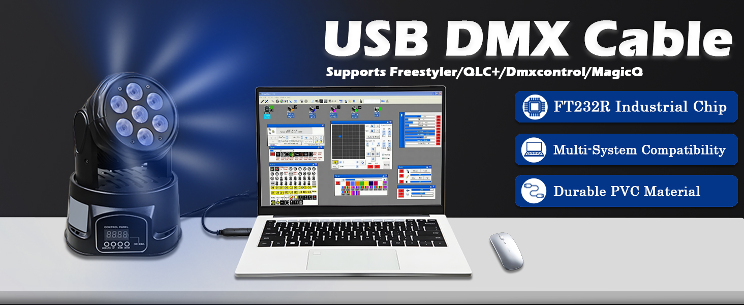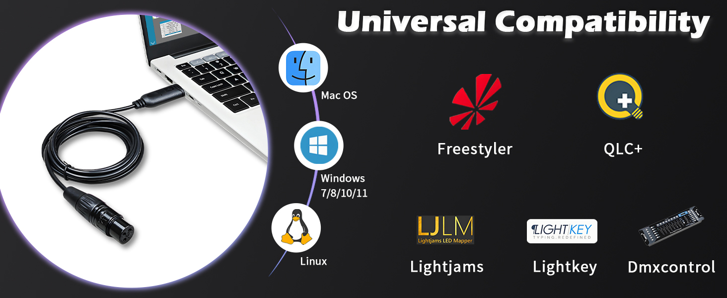 [التوافق] يدعم برنامج Freestyler وDmxcontrol وQLC+ وSoundswitch Lightkey Lightjams DMX، وهو متوافق مع Windows 11/10/8/7 وLionx وMac OS والمزيد من أنظمة التشغيل. (غير متوافق مع Magic Q)