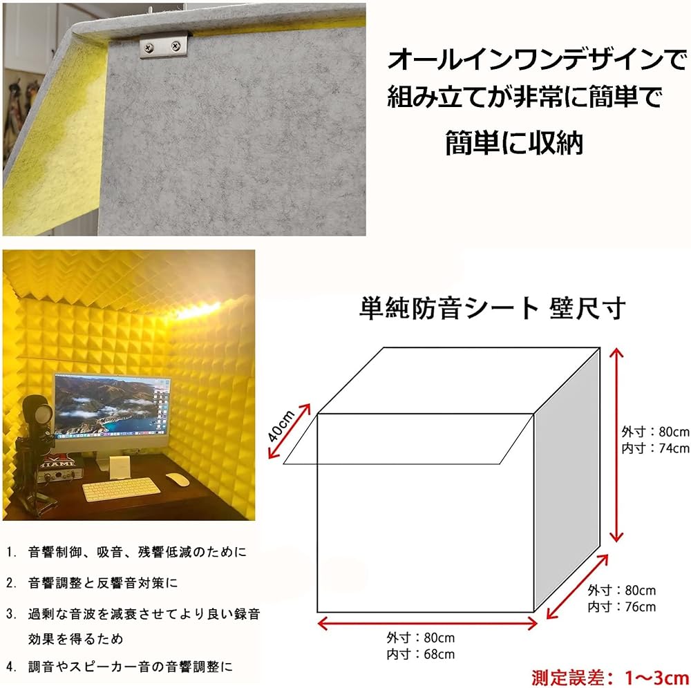 • 【Size】Width 80 X Depth 80 X Height 80 Cm. Plenty of Space to Work. It Makes up for the Shortcomings of Large Recording Studios That Take up Space and Expands the Internal Space. It Can Be Installed Directly on the Desktop, Easy to Install and