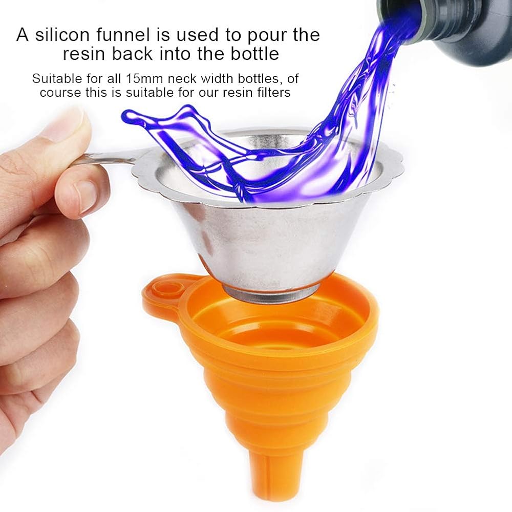 • Otherwise, fragments that cannot be printed, broken supports and other solidified waste can contaminate the bottle. This silicone funnel is easy to clean.
