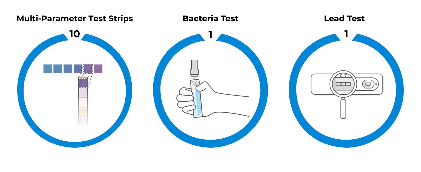 فحص DIY: يوفر Safe Home مجموعة اختبار المياه DIY الوحيدة التي تستخدم كواشف درجة ACS (الجمعية الكيميائية الأمريكية) فائقة الحساسية في آليات الفحص لدينا، والتي توفر لك نتائج أكثر موثوقية. تحصل على 10 شرائط اختبار تفحص كل منها 12 معلمة مختلفة (انظر القائمة المرفقة). يمكنك أيضًا الحصول على اختبار واحد لكل من مجموعات اختبار الرصاص والبكتيريا الأكثر مبيعًا لدينا. هذا إجمالي 122 اختبارًا DIY.
