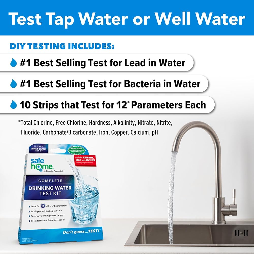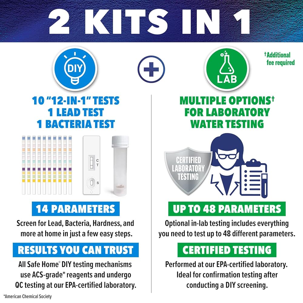 طقم اختبار مياه الشرب الكامل Safe Home® - فحص DIY لـ 14 معلمة + اختبار اختياري في مختبرنا المعتمد من وكالة حماية البيئة (EPA) لما يصل إلى 48 معلمة - صُنع في الولايات المتحدة الأمريكية