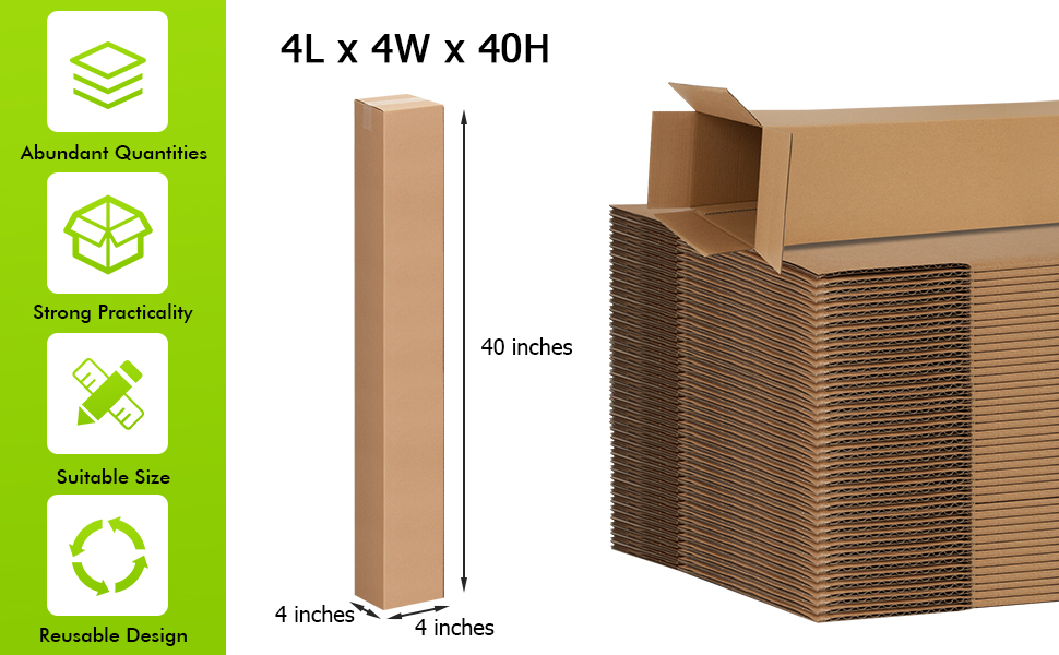 جودة احترافية: يبلغ قياس صناديق الشحن الطويلة لدينا 4 بوصات طول × 4 بوصات عرض × 40 بوصة ارتفاعًا، وهي مصنوعة من الورق المقوى المموج بدرجة احترافية للحصول على قوة وكثافة وصلابة فائقة. تتميز هذه الصناديق المصممة لتحمل الضغط والرطوبة بمظهر خارجي أملس للحصول على مظهر نظيف واحترافي