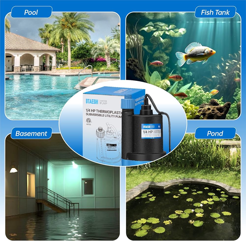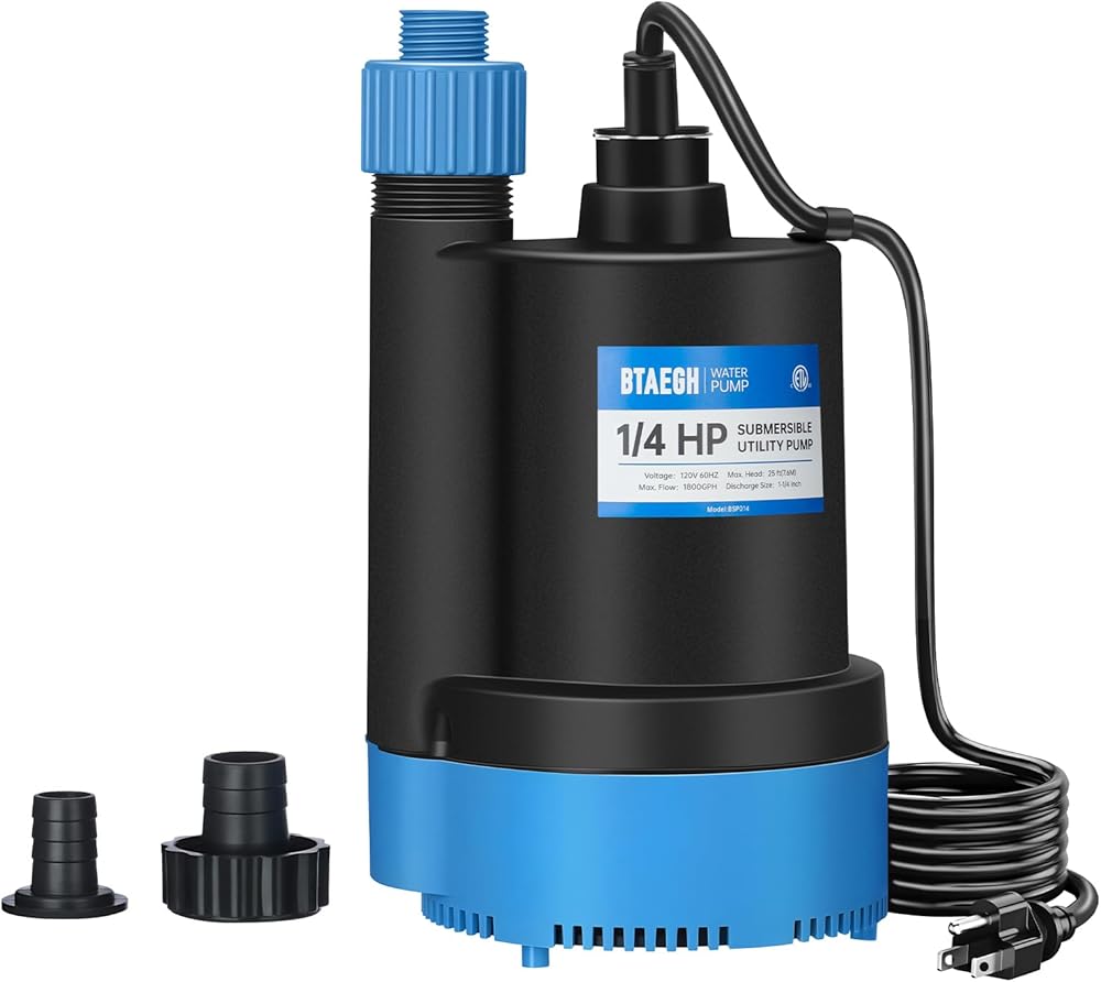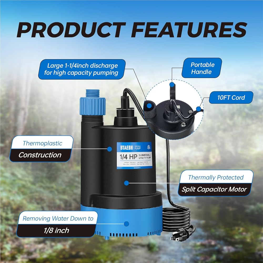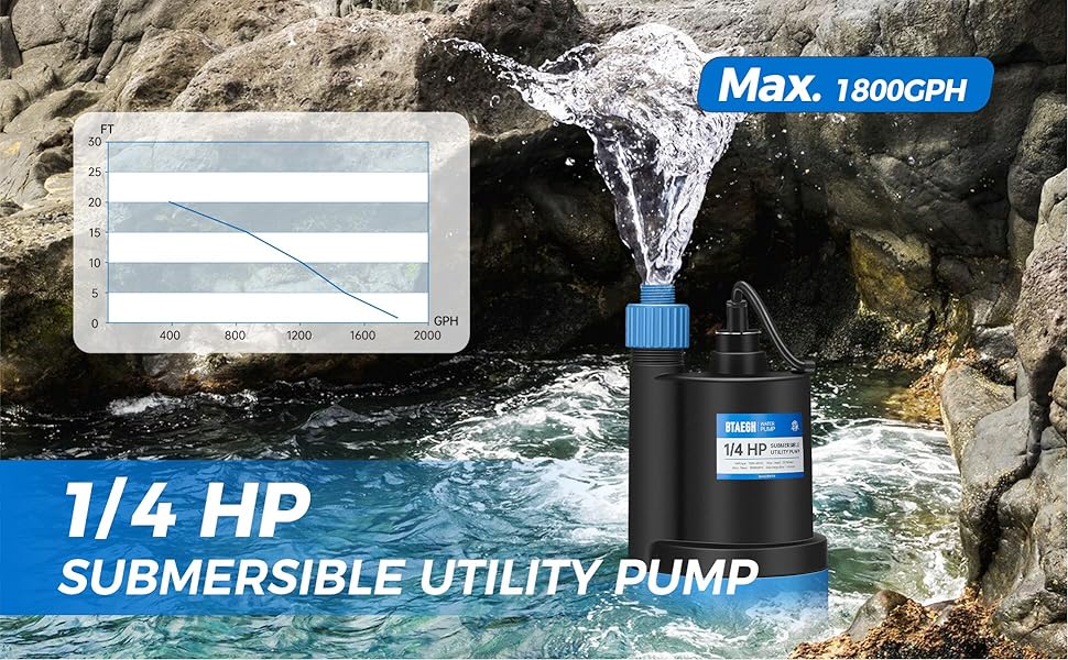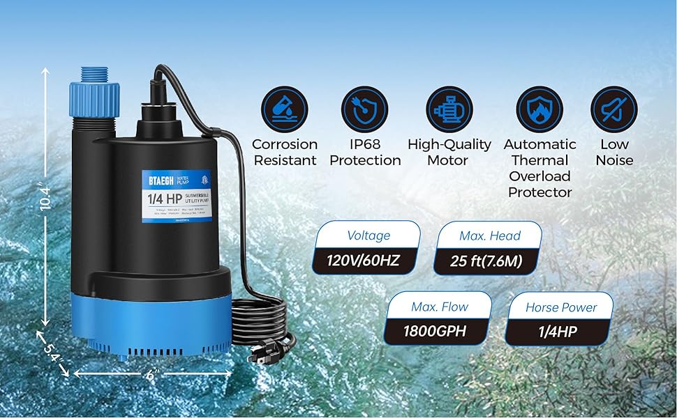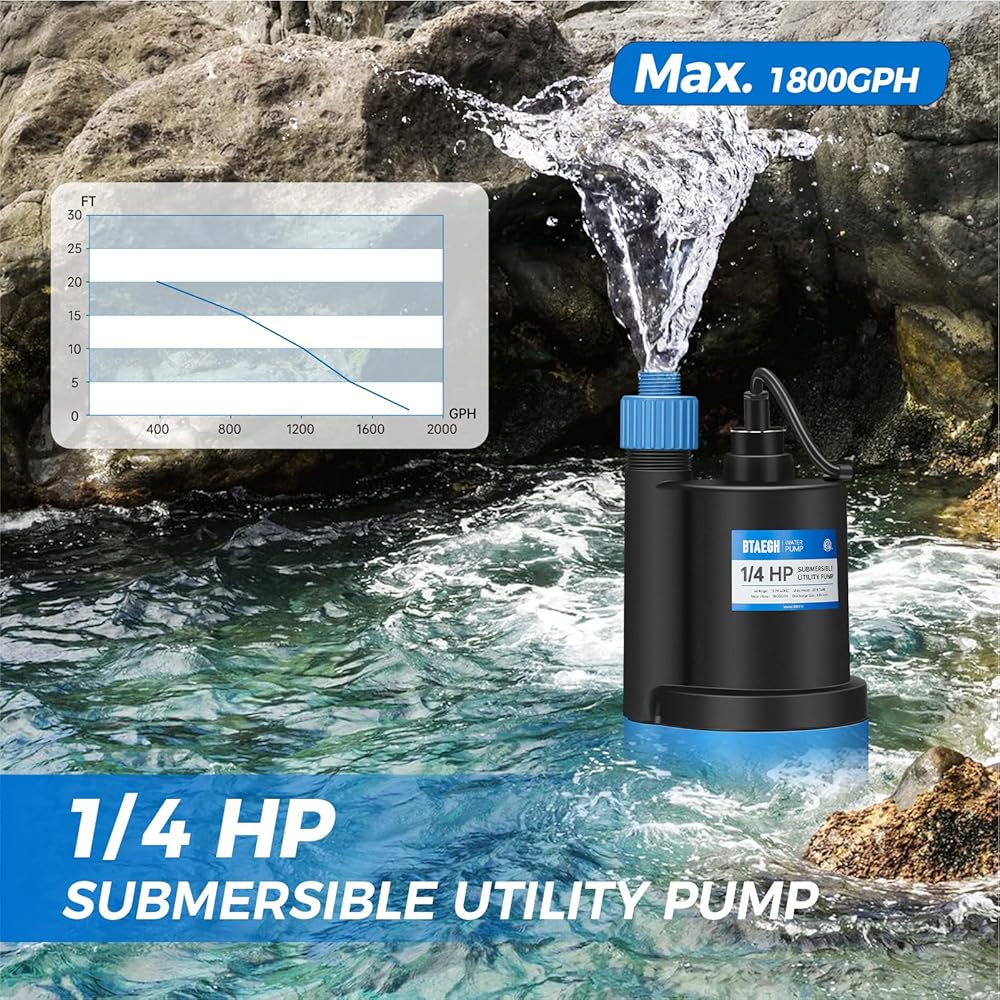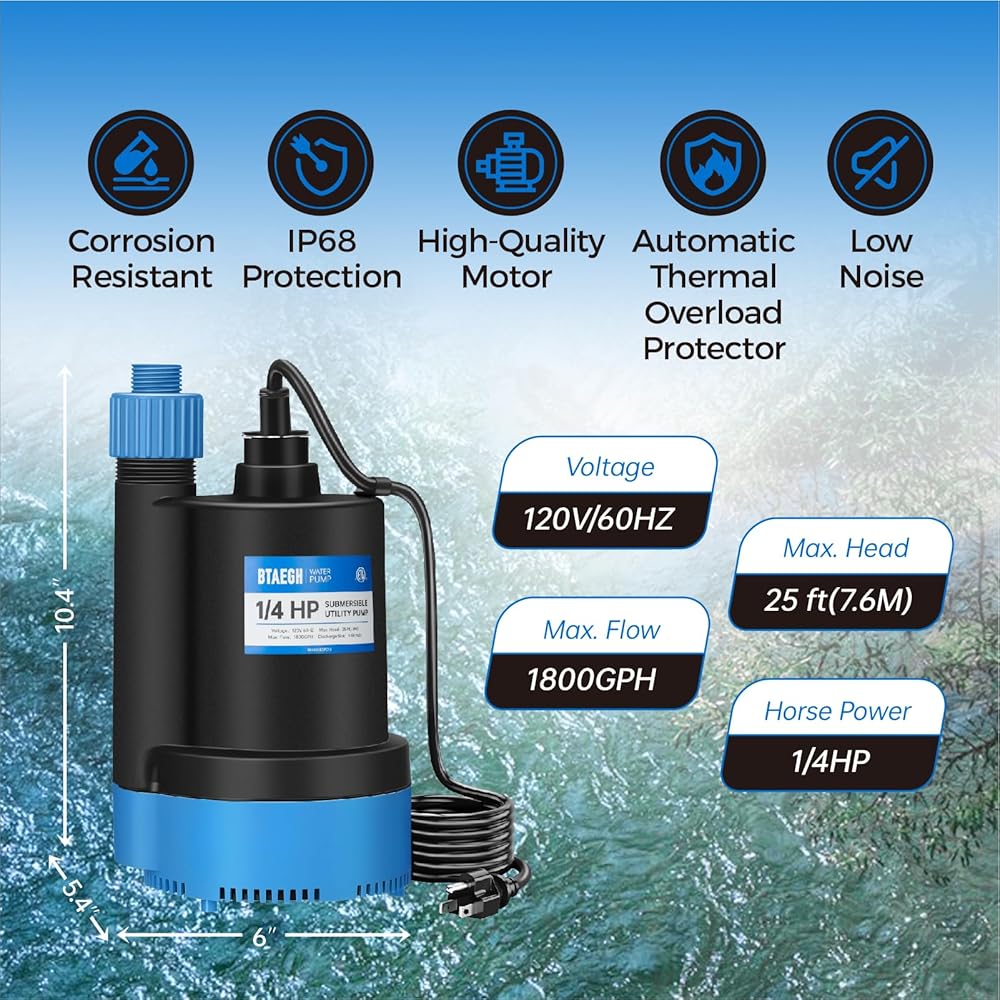 【مضخة مستنقع فعالة】تتميز مضخة المياه الغاطسة هذه بمحرك بقوة 1/4 حصان، قادر على تصريف ما يصل إلى 1800 جالون في الساعة (30 جالونًا في الدقيقة) ورفع المياه إلى ارتفاع عمودي يبلغ 25 قدمًا.
