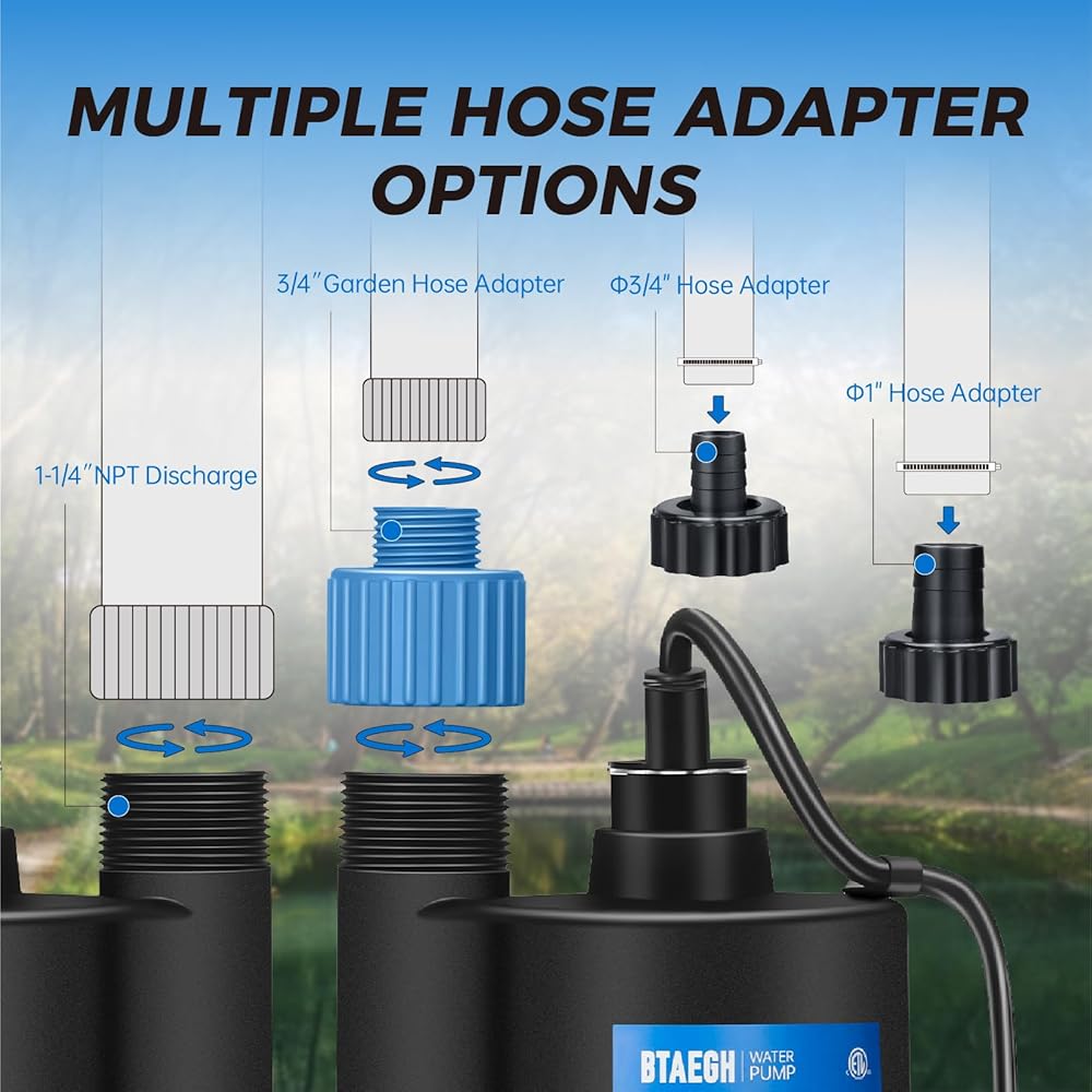 【تطبيقات واسعة】مثالية لإزالة المياه المنزلية في أماكن مثل حمامات السباحة، والصهاريج، والأقبية، ومساحات الزحف، والأسطح، وآبار النوافذ. تأتي مضخة الحوض مع محول خرطوم حديقة مقاس 3/4 بوصة، مما يجعلها مثالية للري وتنظيف الحديقة وغسيل السيارات وغيرها من الاحتياجات المنزلية.