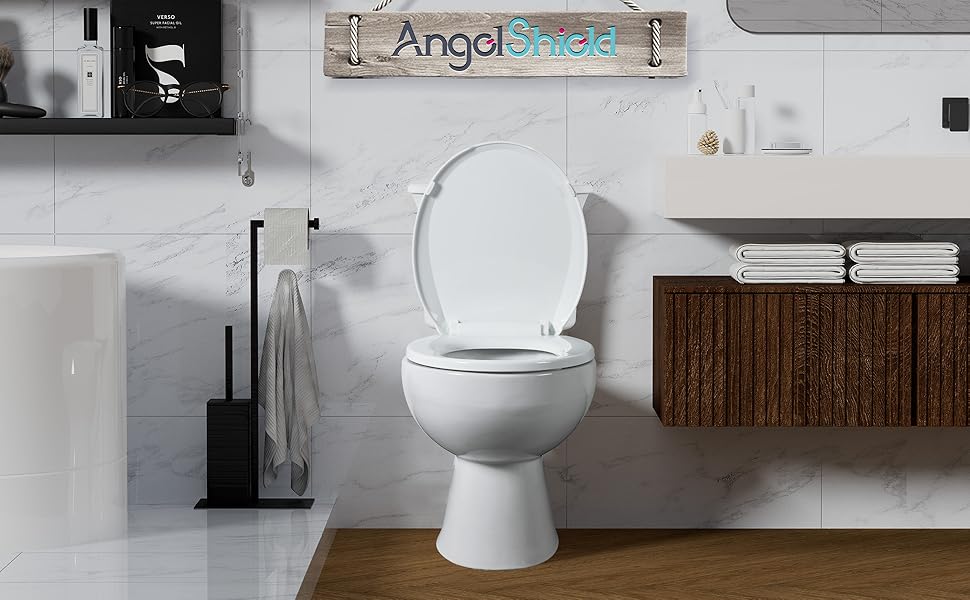 مقعد المرحاض المستدير Angol Shiold ناعم الإغلاق وسريع الفك، غطاء مقاعد المرحاض البلاستيكي الأبيض مقاوم للصدأ (16.5 بوصة، حديث)