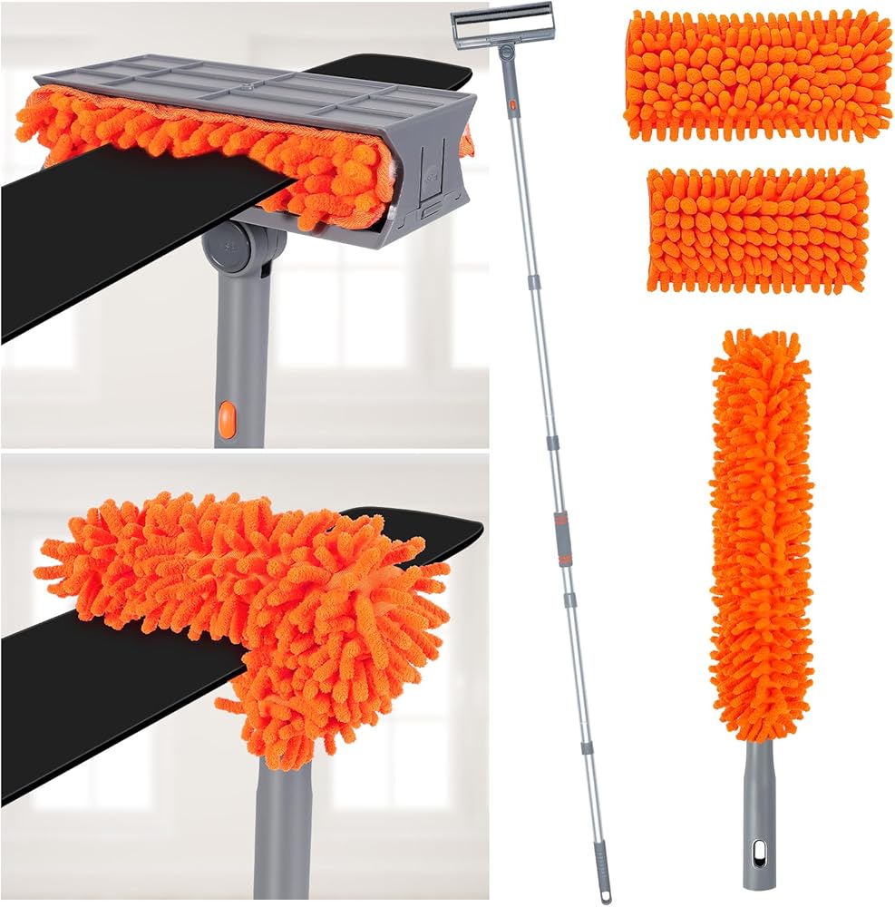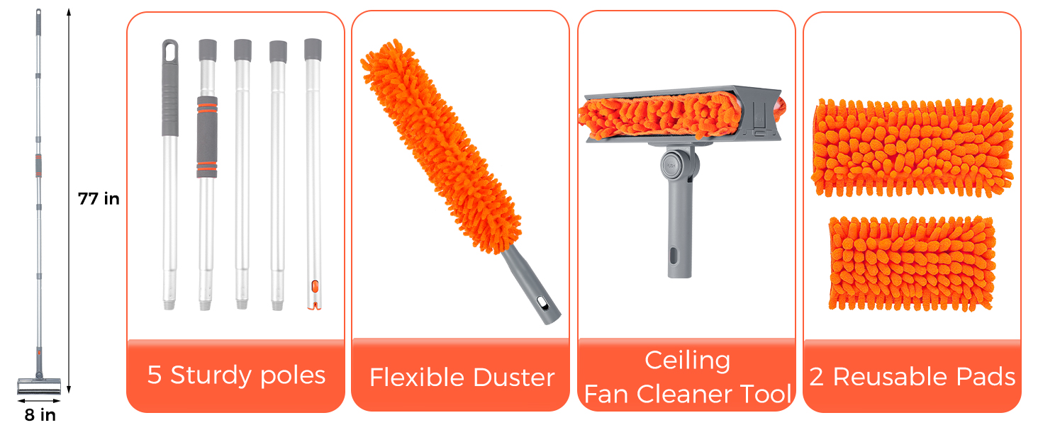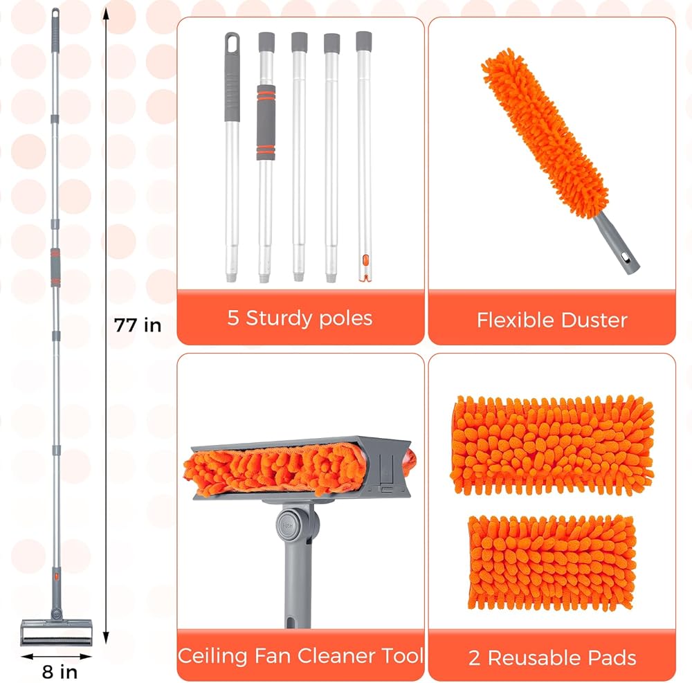 قضيب تمديد قابل للتعديل - منظف مروحة السقف مع قضيب تمديد 5 أقسام، ويمتد منفضة الغبار من 32 بوصة إلى 87 بوصة. مع وصول شفرة المروحة من 22 بوصة إلى 77 بوصة، فهي مناسبة لمهام التنظيف المختلفة.