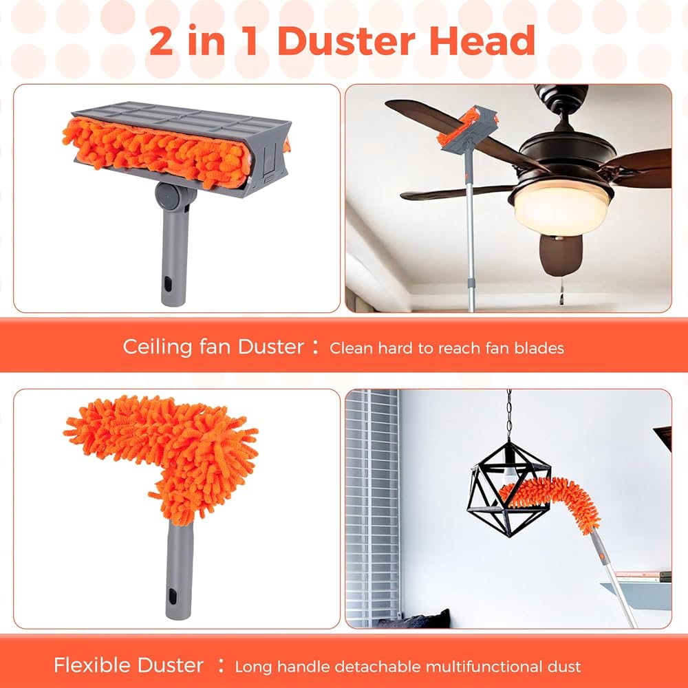 تصميم 2 في 1 - تتميز مجموعة فرش تنظيف المروحة هذه بشفرة مروحة قابلة للفصل ورؤوس غبار، مما يسمح لك بتنظيف المراوح والجدران وألواح القاعدة والنوافذ والستائر والبلاط والأرضيات دون استخدام سلم.