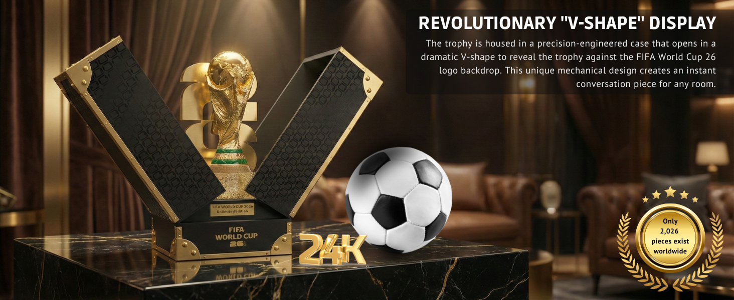 نسخة طبق الأصل مرخصة رسميًا لكأس العالم FIFA 2026 ثلاثية الأبعاد مع علم البطل الذي يمكنك صنعه بنفسك - صندوق عرض فاخر من الخشب والجلد يضم خريطة 16 مدينة مضيفة - إصدار محدود (10,000 على مستوى العالم)