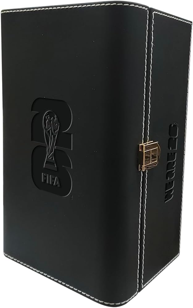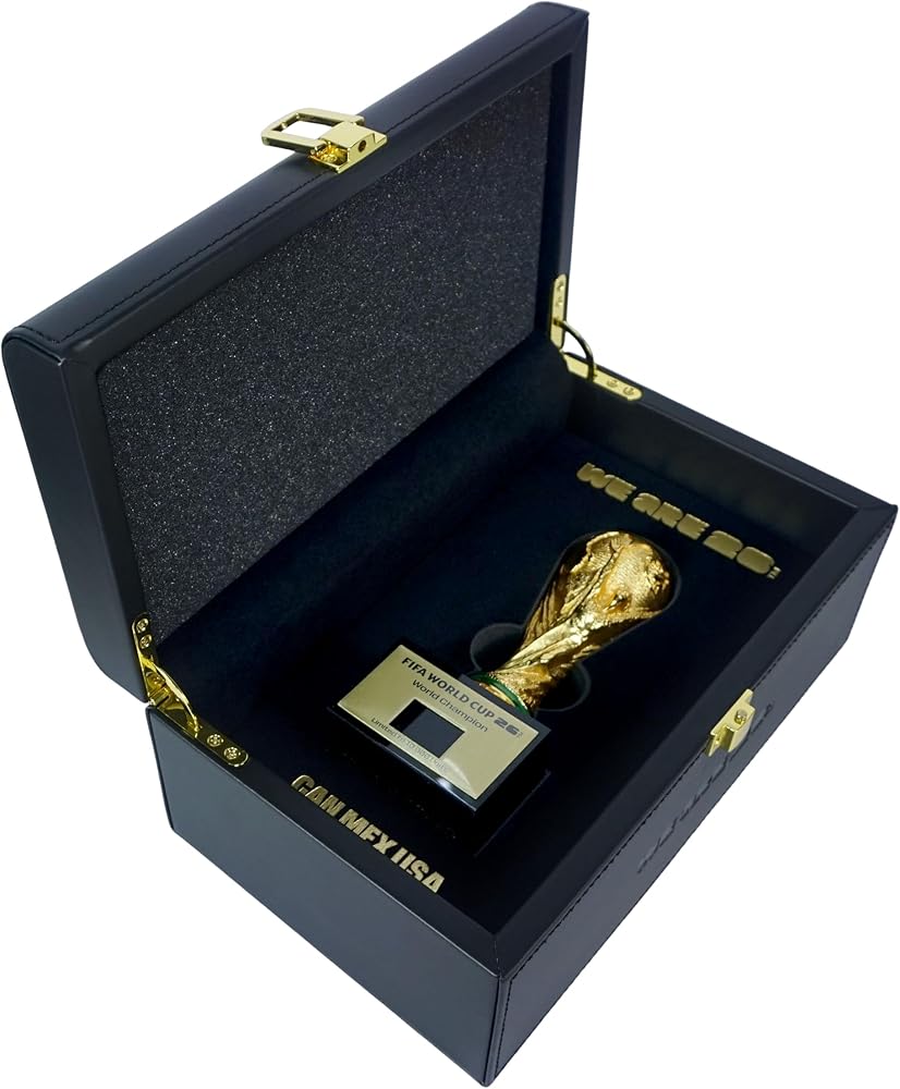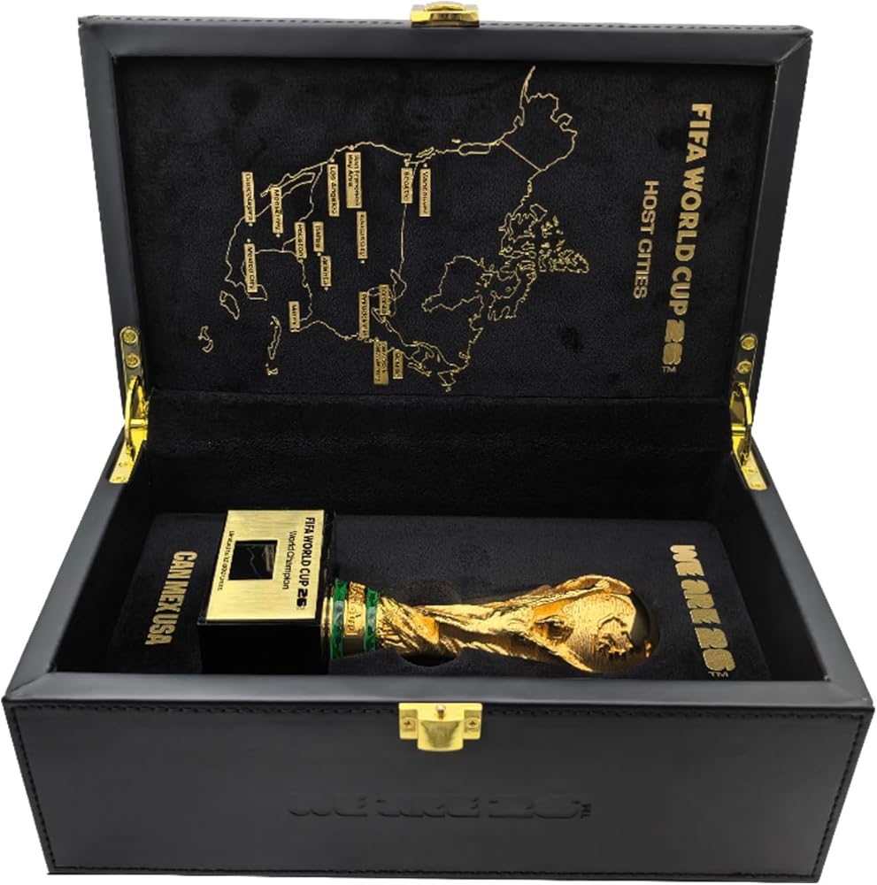 خريطة مضيفة حصرية لـ 16 مدينة: توجد الكأس في صندوق عرض مذهل مصنوع من الخشب والجلد عالي الجودة. تم تمييز الجزء الخارجي بشكل أنيق بخريطة تفصيلية للمدن الـ 16 المضيفة في جميع أنحاء أمريكا الشمالية، مما يجعلها سجلاً تاريخيًا نهائيًا لأكبر توسع للبطولة.