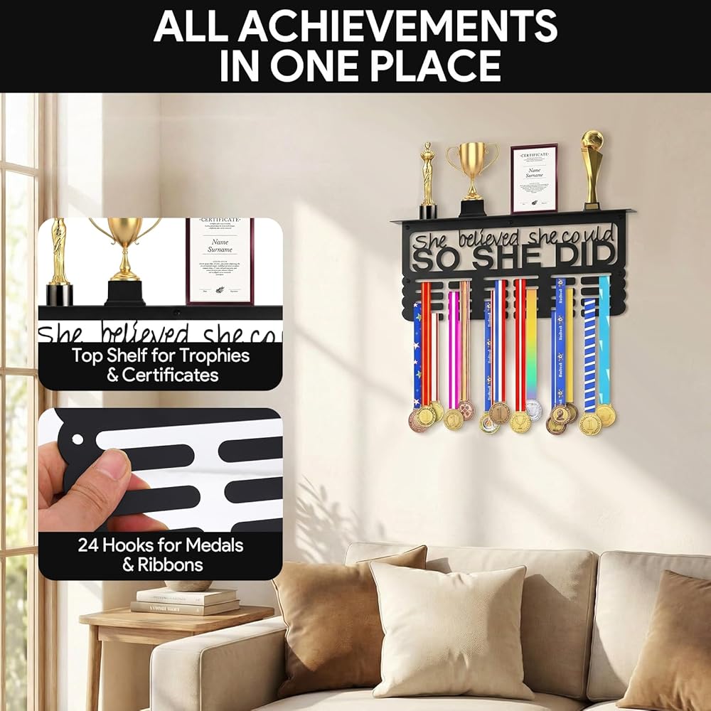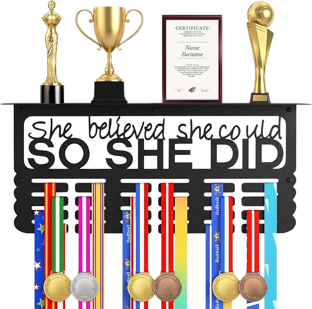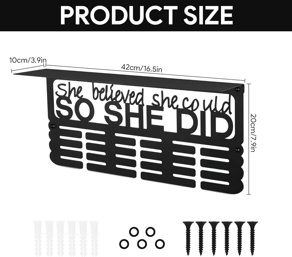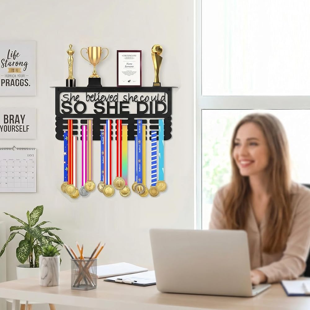 هدية ملهمة للنساء: تصميم معدني أسود أنيق يتميز بعبارة "She Believed She Can، So She Did". حامل الميداليات هذا عبارة عن قطعة ديكور أنيقة ومصممة خصيصًا للنساء لعرض ميدالياتهن وجوائزهن وشهادات الإنجاز التي حصلن عليها بشق الأنفس.