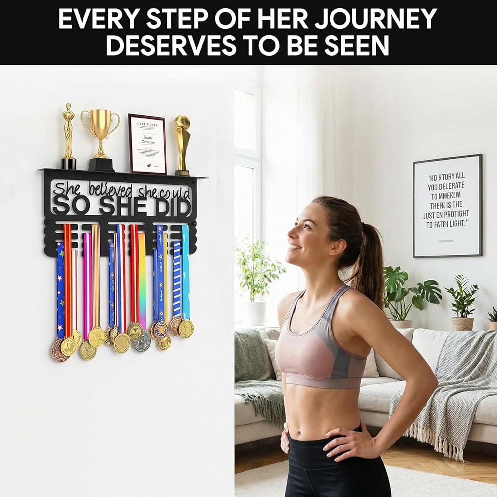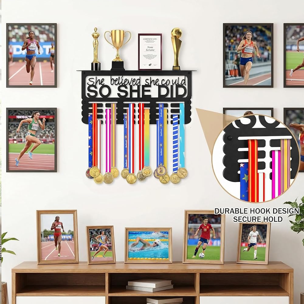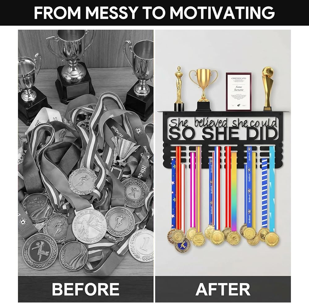 هدية ملهمة للنساء: تصميم معدني أسود أنيق يتميز بعبارة "She Believed She Can، So She Did". حامل الميداليات هذا عبارة عن قطعة ديكور أنيقة ومصممة خصيصًا للنساء لعرض ميدالياتهن وجوائزهن وشهادات الإنجاز التي حصلن عليها بشق الأنفس.