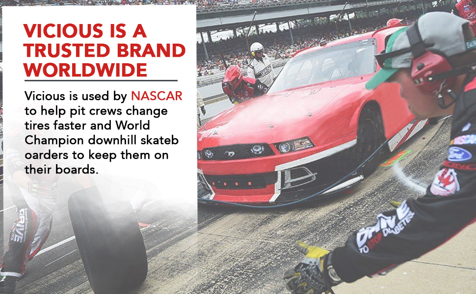 ضمان الرضا بنسبة 100%. Vicious هي علامة تجارية موثوقة في جميع أنحاء العالم لمدة 10 سنوات. يتم استخدام Vicious بواسطة NASCAR لمساعدة أطقم الحفر على تغيير الإطارات بشكل أسرع ومساعدة المتزلجين على المنحدرات أبطال العالم على إبقائهم على ألواحهم.