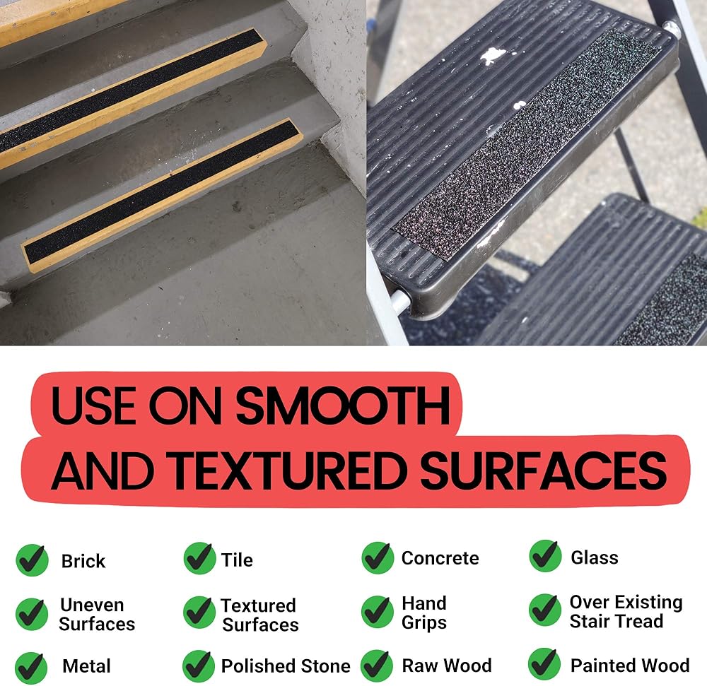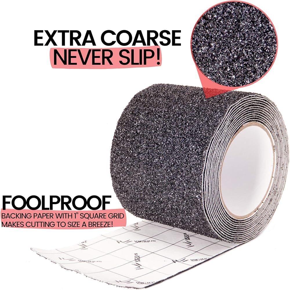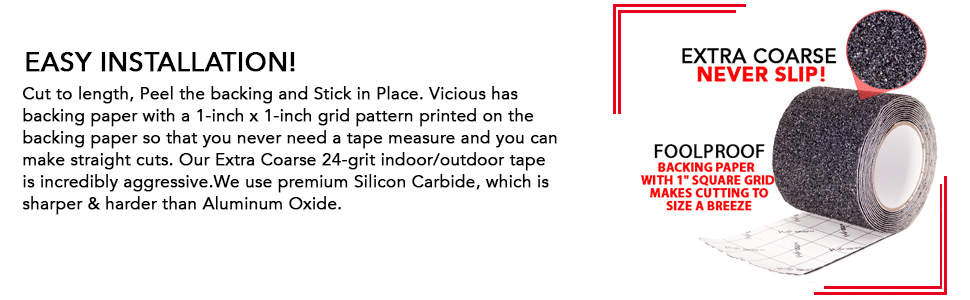 الشريط الأكثر ثباتًا والمضاد للانزلاق على الإطلاق! شريطنا الداخلي/الخارجي فائق الخشونة 24 حبيبة عدواني بشكل لا يصدق. نحن نستخدم كربيد السيليكون الفاخر، وهو أكثر حدة وصلابة من أكسيد الألومنيوم. مثالية للسلالم والسلالم والأرضيات والممرات والسلالم والقوارب والأرصفة وألواح تشغيل الشاحنات.