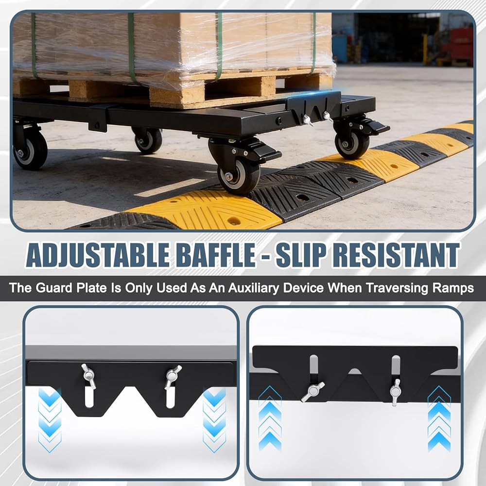 حواجز مضادة للانزلاق قابلة للتعديل: تم تجهيز الدمية المتحركة شديدة التحمل بحاجزين مضادين للانزلاق في كلا الطرفين. يمكن رفعها لمنع انزلاق الحمولة عند التنقل على المنحدرات، ويمكن سحبها لتوفير مساحة أكبر للحمولة عند عدم استخدامها