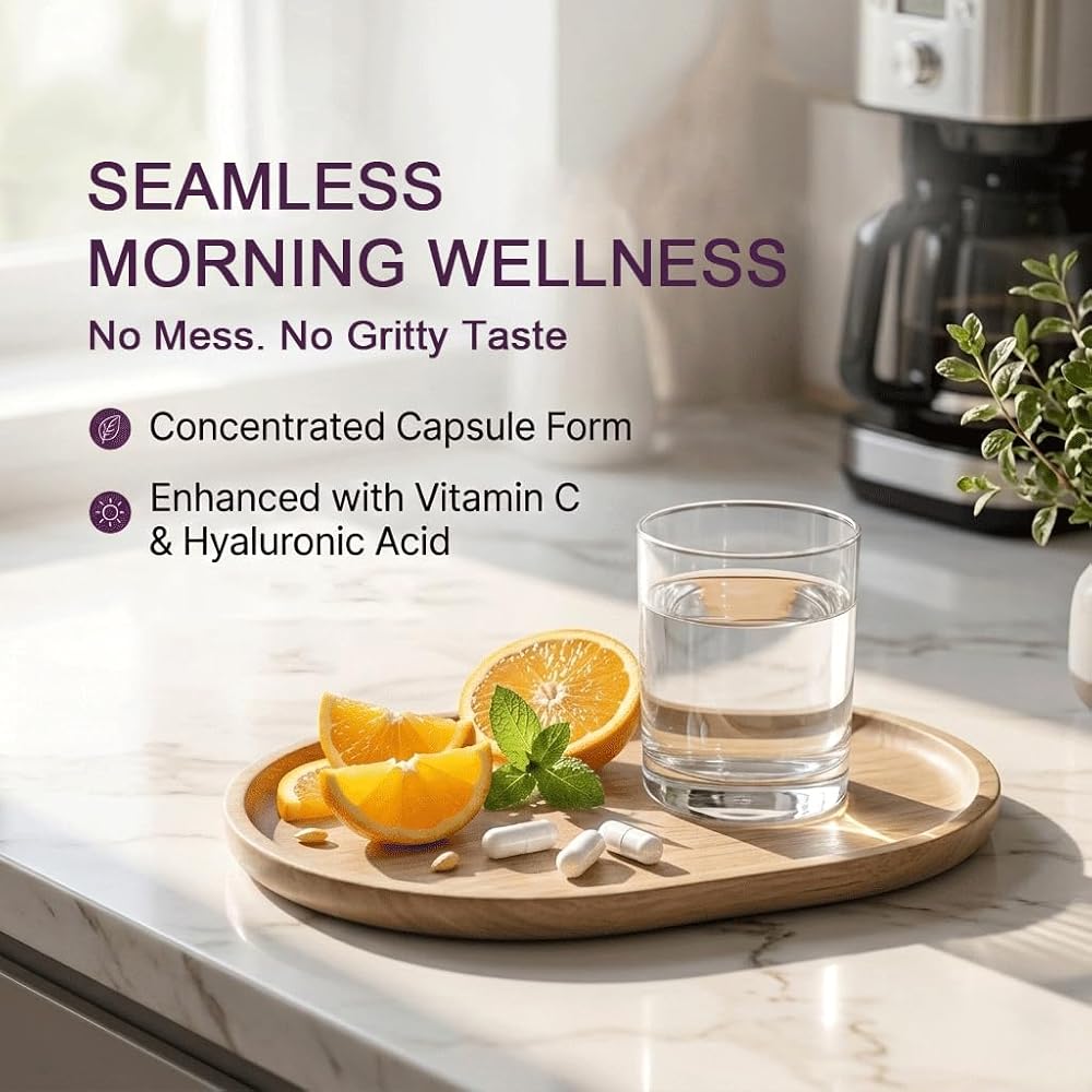 MAXIMUM BIOAVAILABILITY WITH ADDED VITAMIN C Our easy-to-swallow capsules feature added Vitamin C and Hyaluronic Acid to enhance nutrient absorption and promote natural collagen synthesis. Unlike standard powders, this concentrated capsule form fits seamlessly into your morning wellness routine without any gritty taste or mixing.