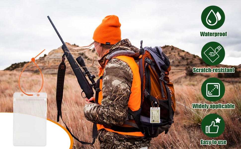 - رائعة لرحلات الصيد وصيد الغزلان أو الديك الرومي وموسم الرماية والأنشطة الخارجية الأخرى حيث يجب أن تظل التصاريح مرئية ومحمية.