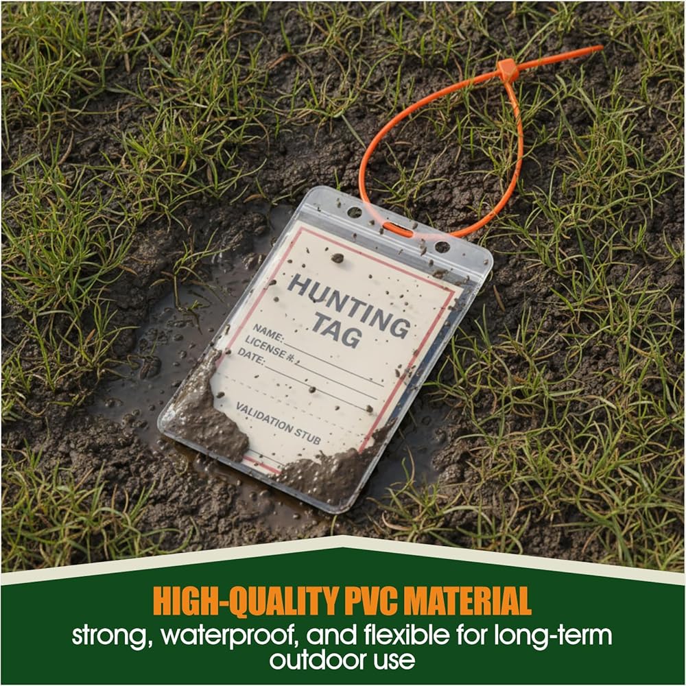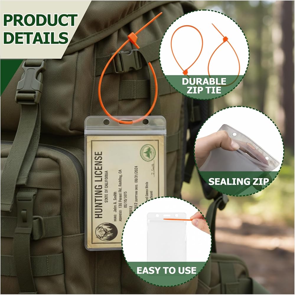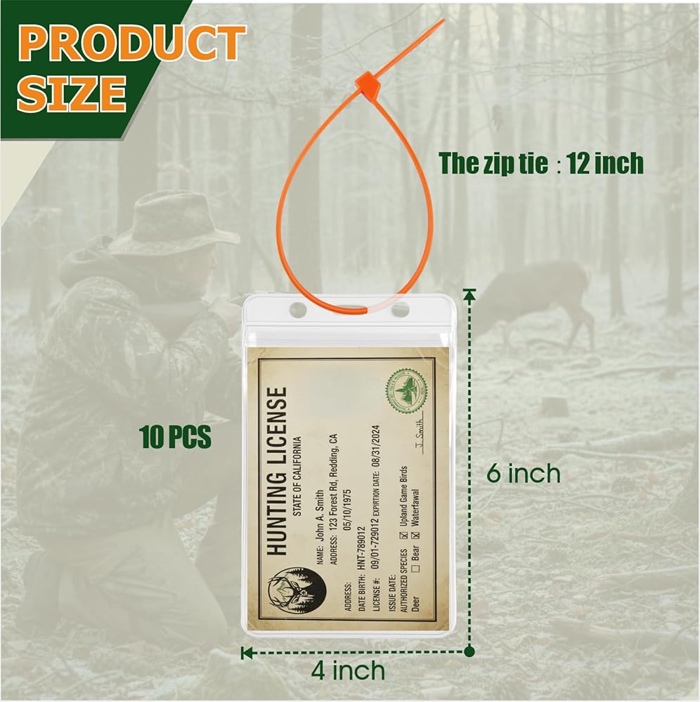 - تتضمن 10 حاملات تراخيص شفافة و10 أربطة بسحاب، مثالية لحماية تصاريح الصيد أو الصيد أثناء الأنشطة الخارجية مثل رحلات الصيد أو موسم الصيد أو التخييم.