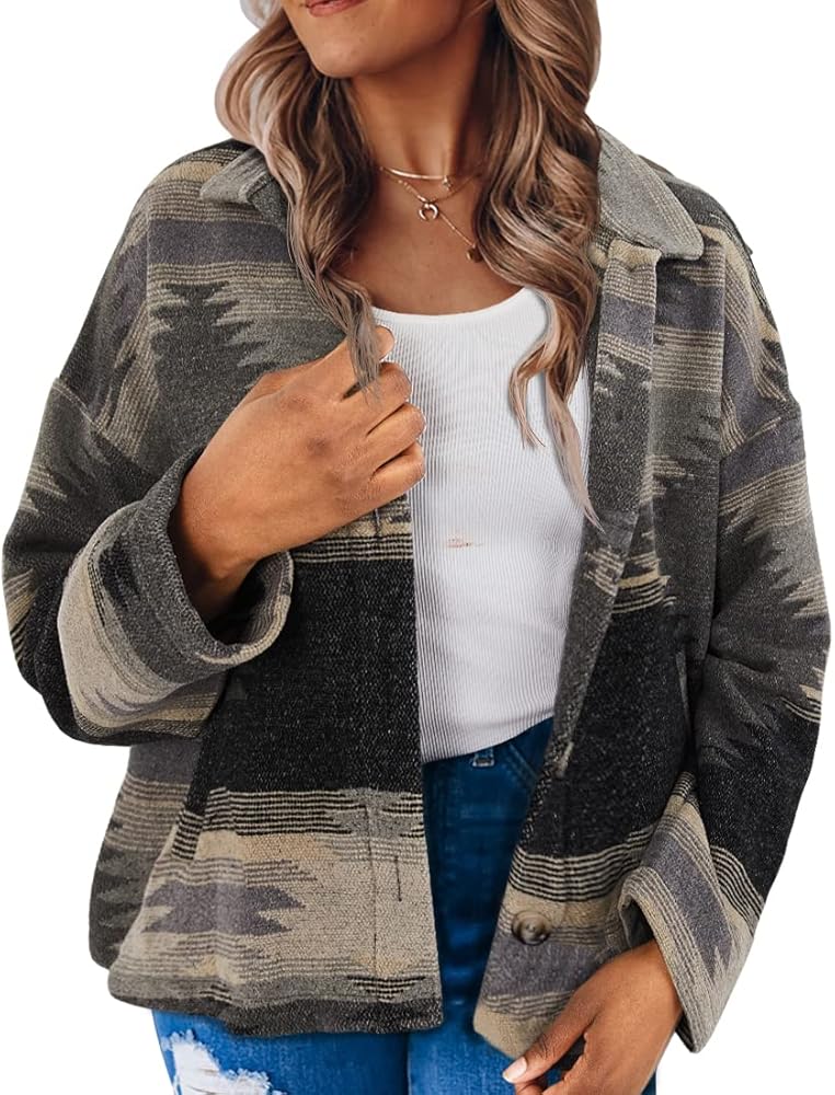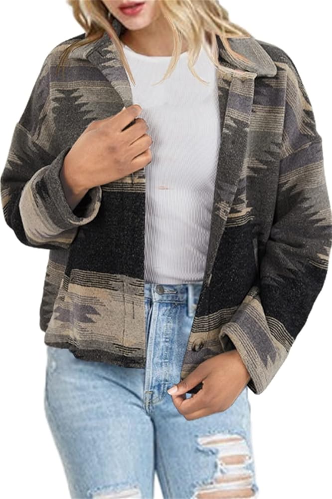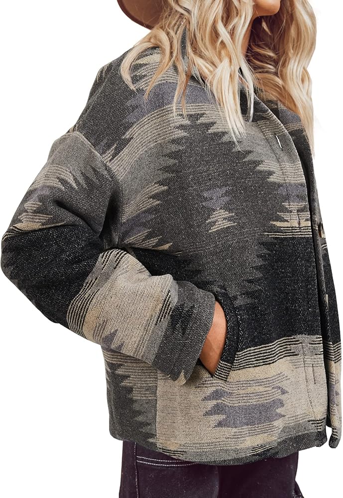 ✅سترة نسائية بوهو بوهيمي أزتيك عتيقة بأزرار سفلية / مقاس فضفاض / أنماط هندسية / كتف منسدل / أزرار عمل / جيوب على الجانبين / رقبة عالية / سترة أزتيك عصرية