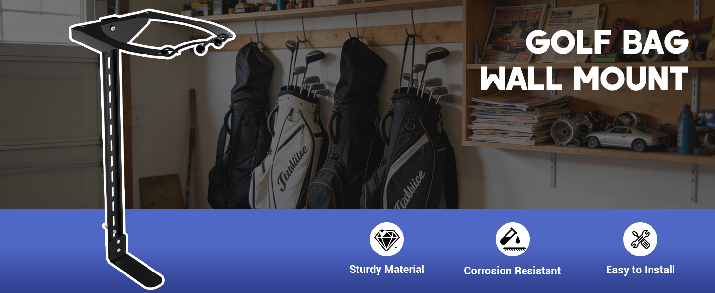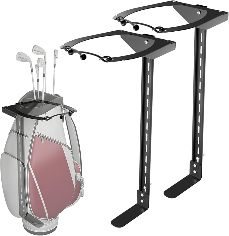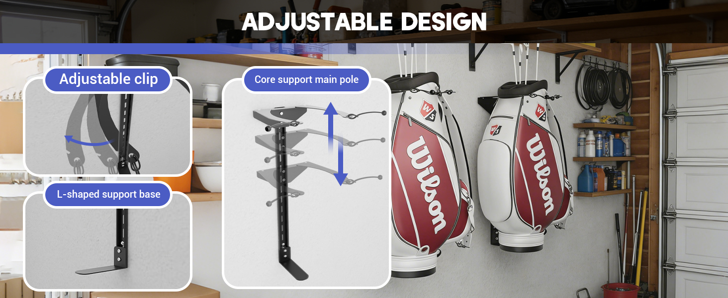 • Adjustable Design: This wall mount golf bag holder features an innovative adjustable clip design. The clips and L-shaped base can also be adjusted vertically to fit different sizes of golf bags, eliminating the hassle of bags slipping off