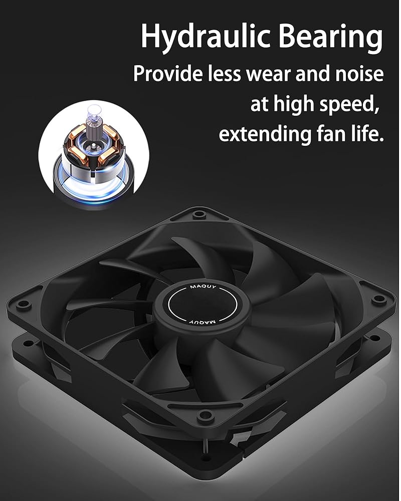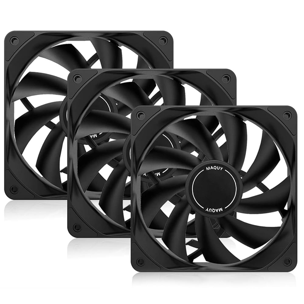 MAQUY 3Pack 120mm Black Computer Case Fans, High Performance Air Cooling Low Noise 4-Pin 1200 RPM Hydraulic Bearing Fans with 8 Dampers