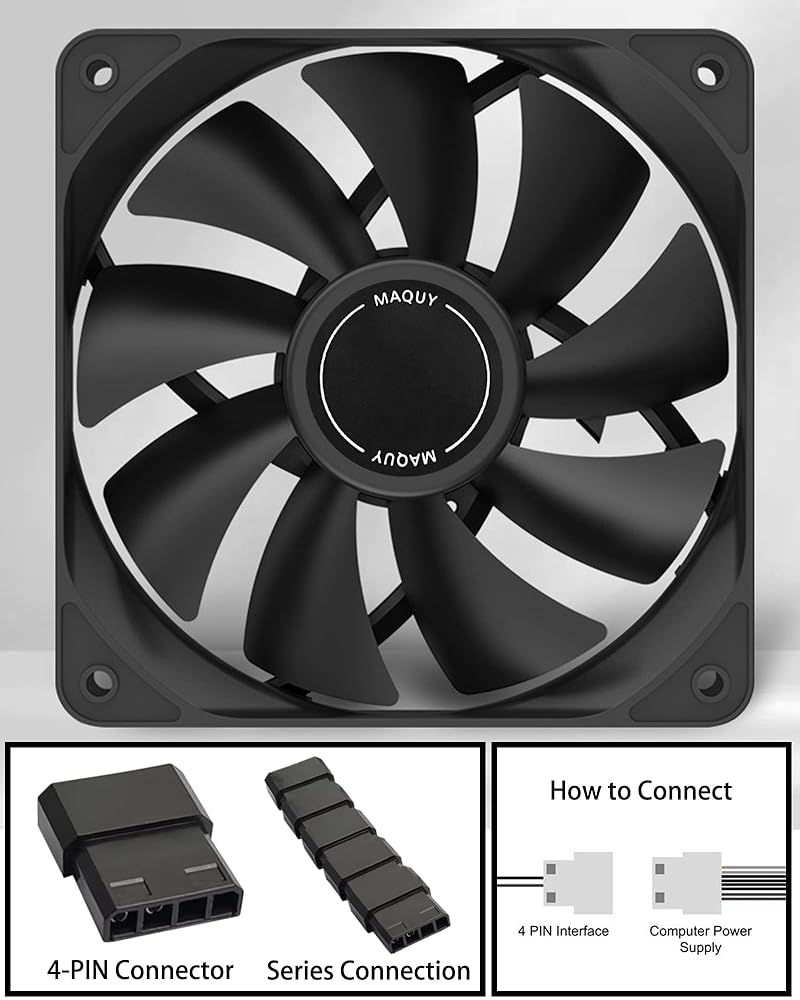 【4-Pin Interface for Direct PSU Connection】This 120mm fan features a versatile 4-pin connector that can plug directly into your power supply unit (PSU). The size of the fan is 120*120*25mm.