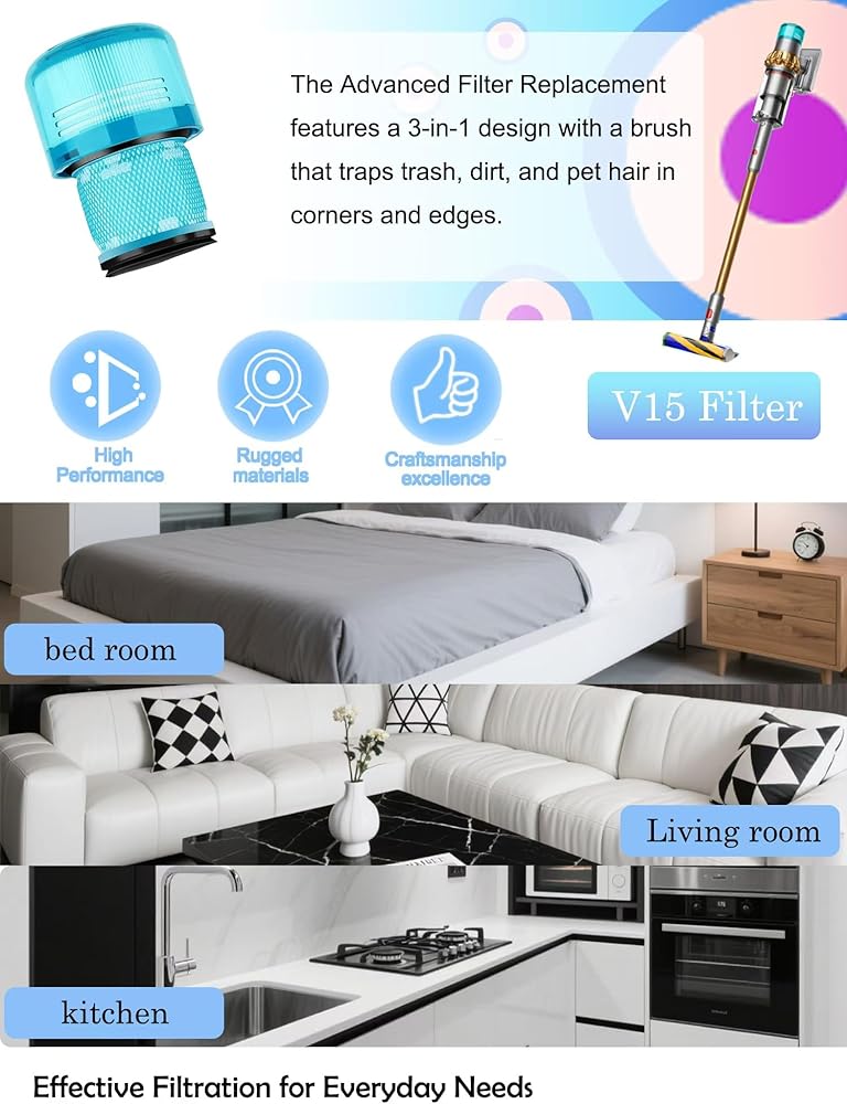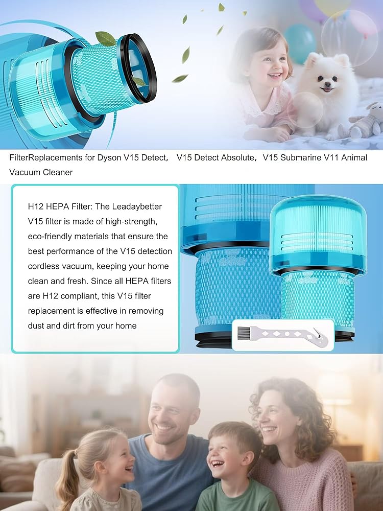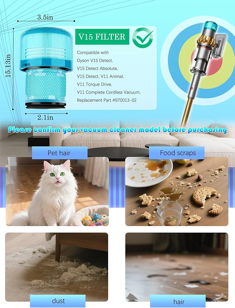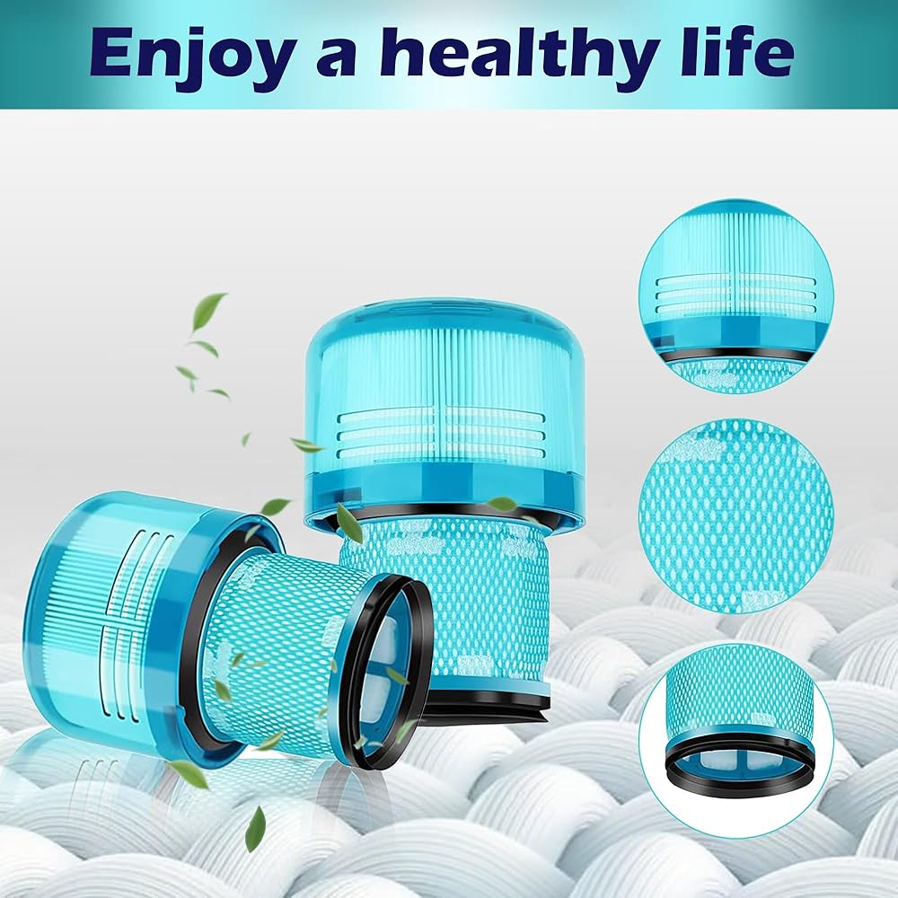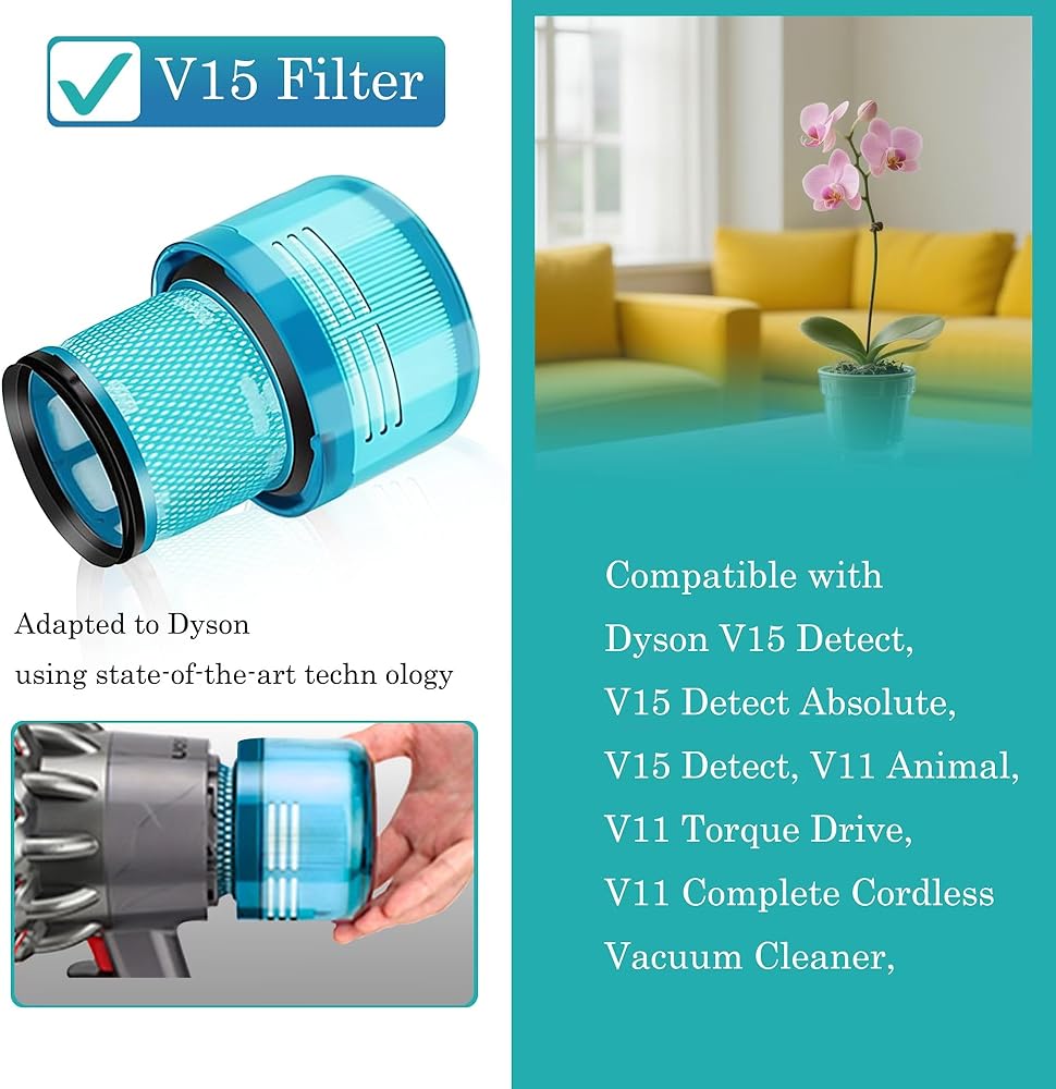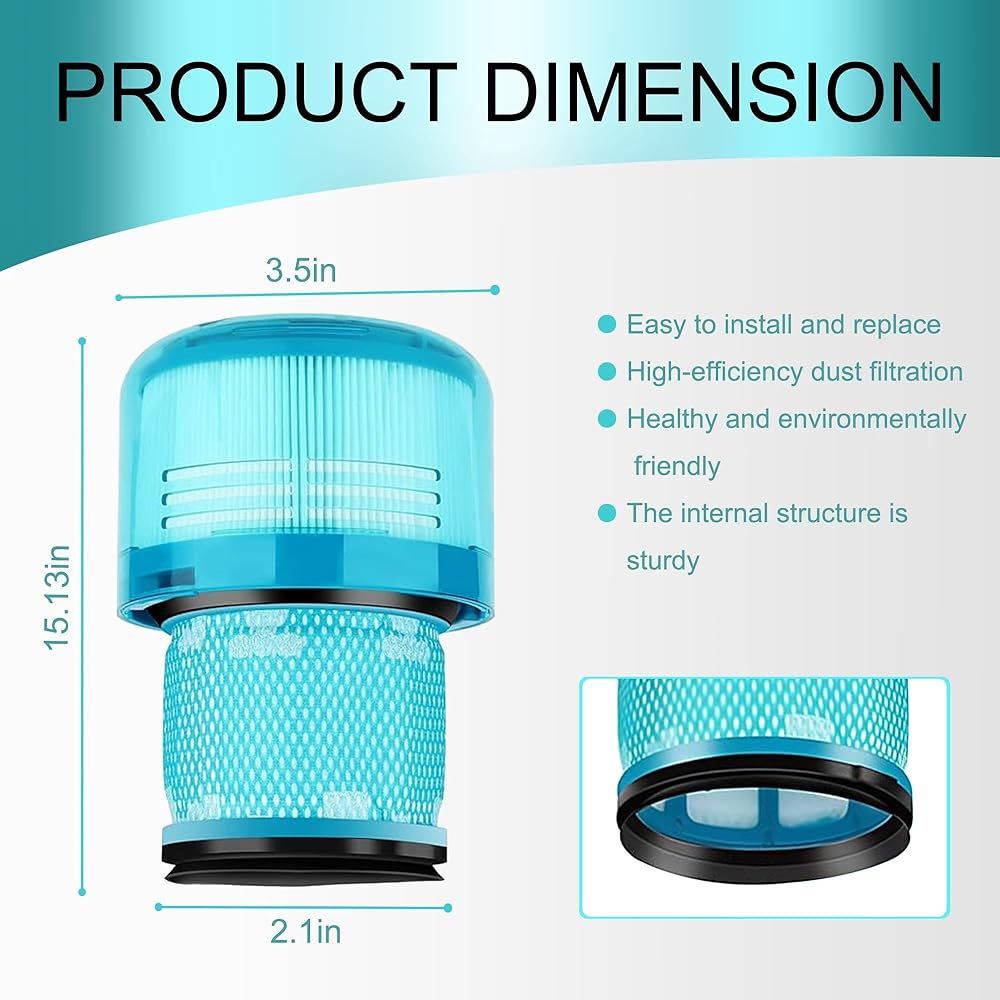 Upgrade your Dyson vacuum cleaning experience with these premium replacement filters designed specifically for V15, V11, and SV14 models. The set includes two high-efficiency dust filters and a convenient cleaning brush for maintenance. These turquoise blue filters feature precise dimensions of 3.5 inches in width, 2.1 inches in depth, and 15.13 inches in height, ensuring a perfect fit for your vacuum. The robust internal structure and advanced mesh design effectively capture fine dust particles while maintaining powerful suction performance. Installation and replacement are straightforward, and the included cleaning brush makes regular maintenance simple and effective. The two-pack ensures you always have a spare filter on hand when needed. These replacement filters help maintain optimal cleaning performance by trapping dust and debris, keeping your living space clean and fresh. Compatible exclusively with Dyson V15, V11, and SV14 cordless vacuum models, these filters are an essential maintenance component for your cleaning routine.