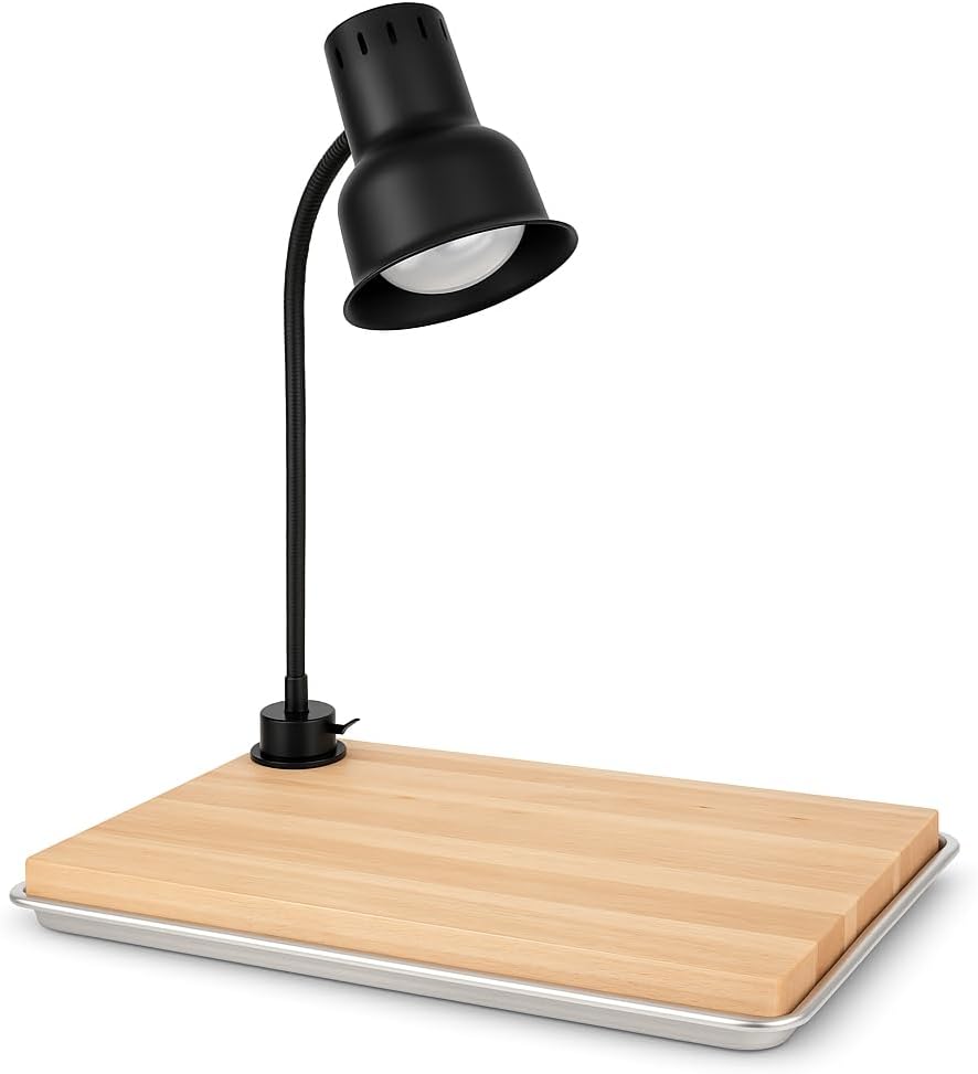 COMPLETE KIT: Professional carving station includes a 250W heat lamp with flexible arm, 24" x 16" rubberwood cutting board, aluminum drip pan, and mounting hardware