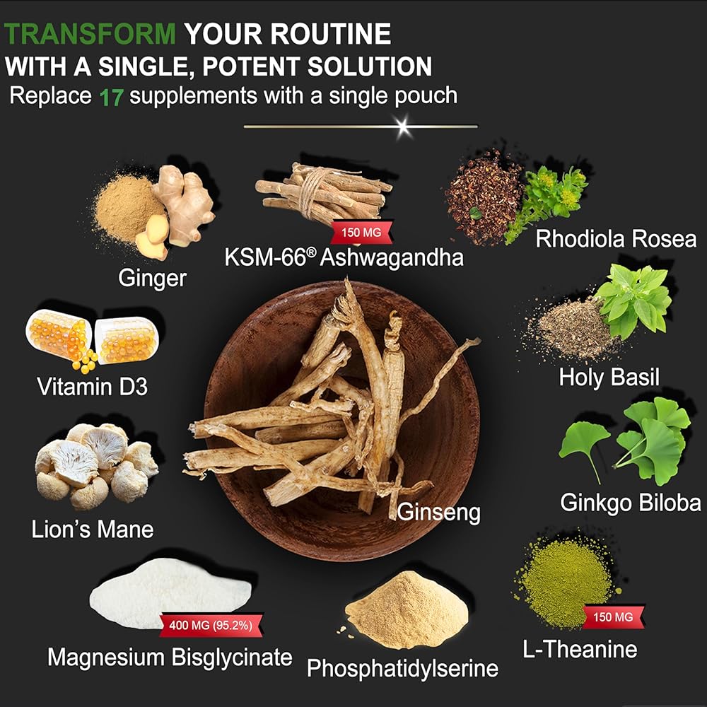 الهدوء تحت الضغط، واضح في ذهنك - ليلاً ونهارًا: - مصمم للإجهاد الحديث، كل علكة تدعم الهدوء العقلي، والطاقة السلسة، والوضوح المركز. يدعم L-Theanine وLion's Mane وPhosphatidylserine التوازن المعرفي، بينما يساعد KSM-66 Ashwagandha وHoly Basil وRhodiola الجسم على التكيف مع متطلبات الإجهاد اليومية.