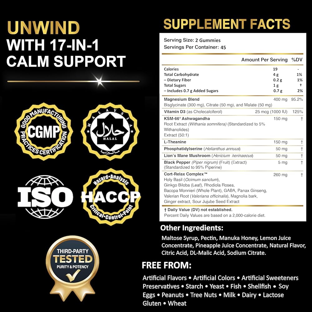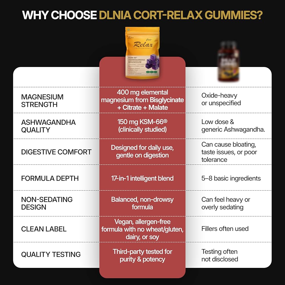 مزيج المغنيسيوم LED الوحيد 17 في 1 للهدوء التام والوضوح :- توقف عن الاستقرار للمغنيسيوم الأساسي أو العلكة المكونة من مكون واحد. تجمع DLNIA بين بيسجليسينات المغنيسيوم مع KSM-66 أشواغاندا، وإل-ثيانين، وعرف الأسد، وفيتامين د3، ومزيج Cort-Relax Adaptogen الخاص بنا لدعم الطاقة الهادئة، والتركيز المريح، والمزاج المتوازن، والاسترخاء أثناء الليل في علكة يومية واحدة كاملة.