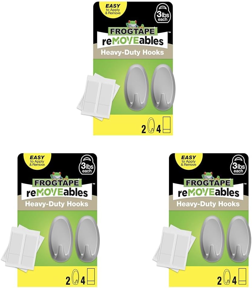 HOLDS THREE POUNDS: Each FrogTape reMOVEables Heavy-Duty Medium Hook holds up to three pounds and can hold a variety of items such as cutting boards, dog leashes, seasonal decorations, bags and more; Brushed nickel finish gives a more decorative look to any space