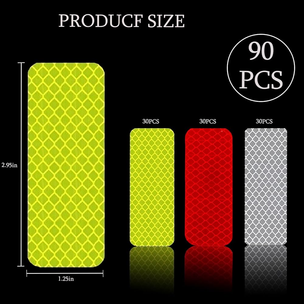 90 Sheets of night reflective tape, 3 colors - yellow, silver, red. Each color has 30 reflective decals. Measures approximately 1.18 x 3.15 inches (3 x 8cm). Perfect size and sufficient quantity to meet your different needs