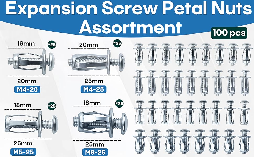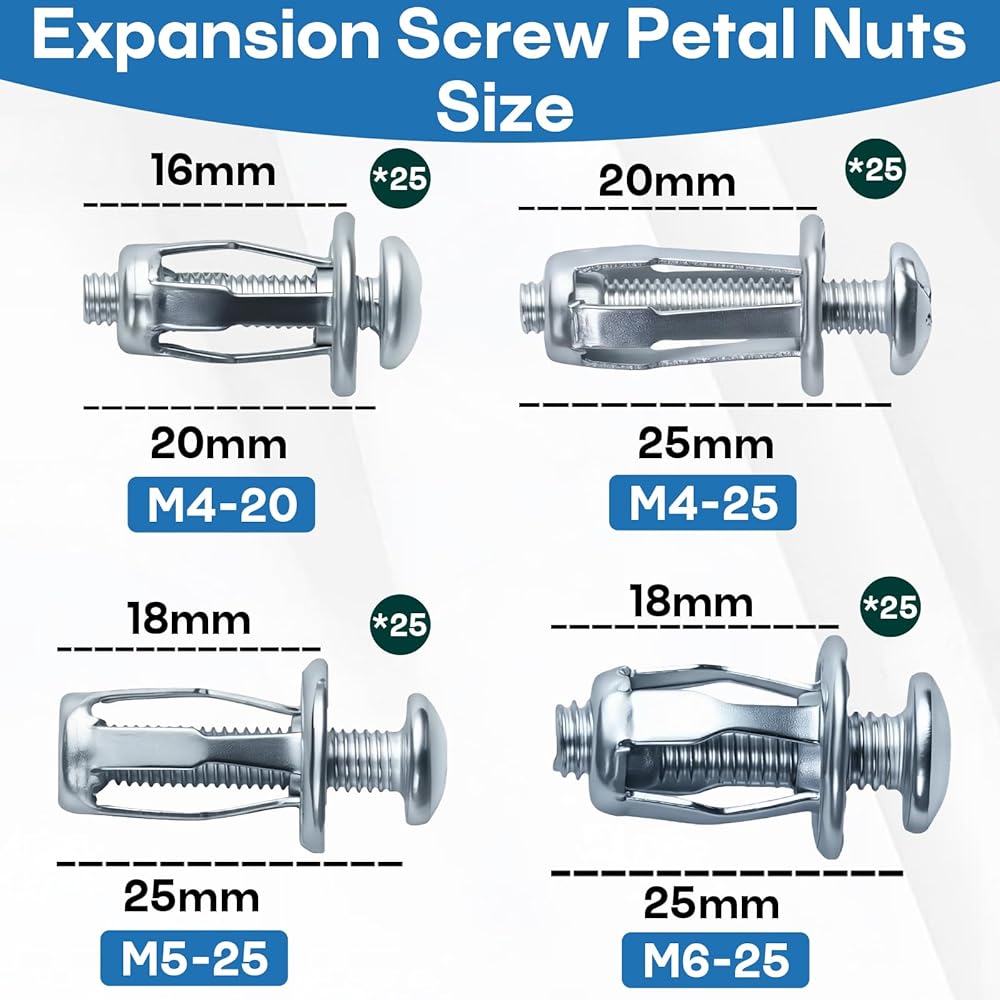 تشكيلة متنوعة من الأحجام: تتضمن 25 قطعة من أحجام M4-20، وM4-25، وM5-25، وM6-25، مما يوفر حلاً شاملاً لمشاريع التثبيت المختلفة ويقلل الحاجة إلى عمليات شراء متعددة
