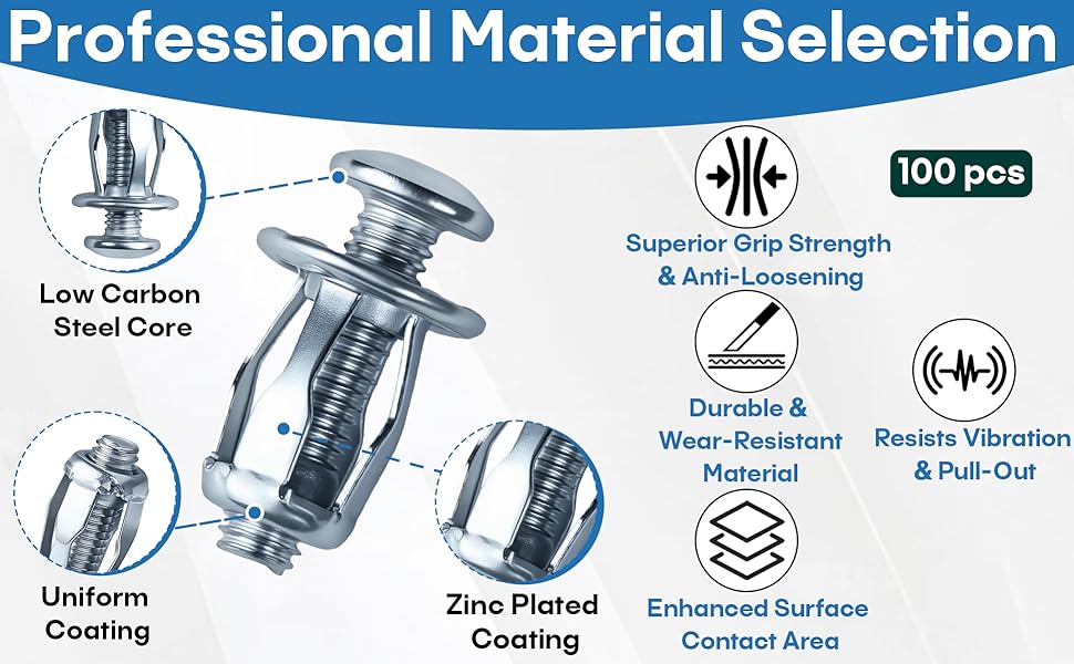 توافق المواد المتعددة: مناسب للبلاستيك والخشب المركب والجدران المجوفة والصفائح المعدنية، مما يجعلها مثالية لتركيب لوحة الترخيص وتركيبات الجدران المجوفة المختلفة