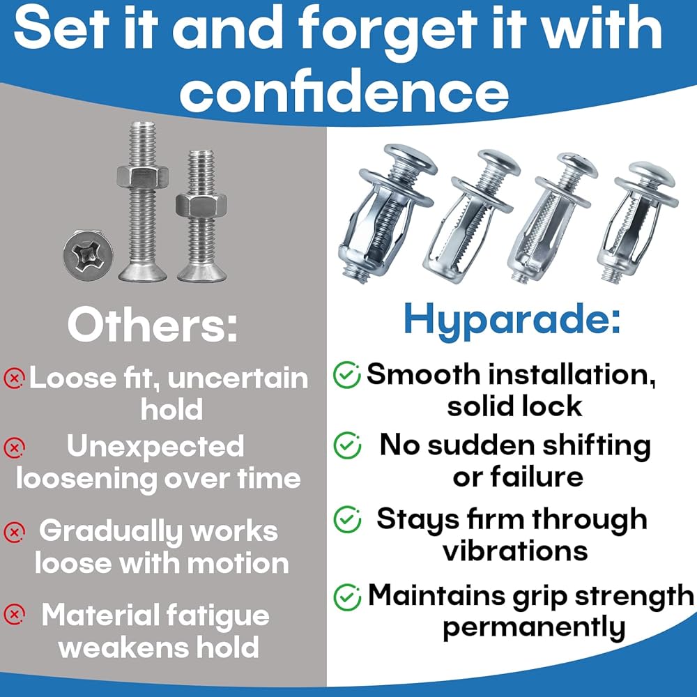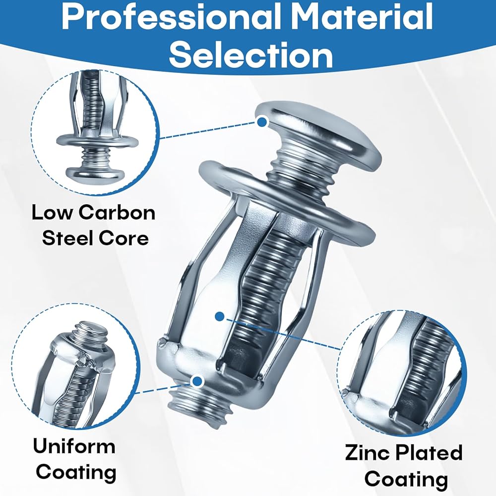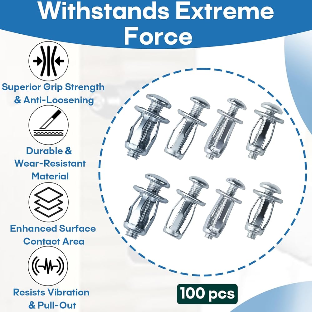 آلية قفل التوسيع: على عكس البراغي القياسية، تتمدد هذه الصواميل مع شد المسمار، مما يخلق سطح تثبيت أوسع داخل المواد المجوفة لزيادة الثبات.