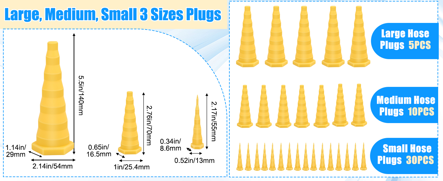 تتضمن العبوة: سوف تحصل على 5 قطع كبيرة، الحجم 5.5 بوصة × 2.14 بوصة × 1.14 بوصة/140 مم × 54 مم × 29 مم؛ 10 قطع بمقاس متوسط، الحجم 2.76 بوصة × 1 بوصة × 0.65 بوصة/70 مم × 25.4 مم × 16.5 مم؛ 30 قطعة صغيرة، الحجم 2.17 بوصة × 0.52 بوصة × 0.34 بوصة/55 مم × 13 مم × 8.6 مم؛ لتناسب أقطار خرطوم وأنابيب مختلفة