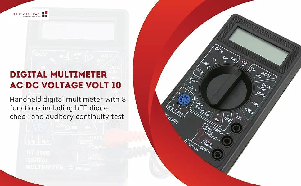 جهاز قياس رقمي متعدد DT-830D مزود بثماني وظائف لقياس جهد التيار المتردد والتيار المستمر، وتيار التيار المستمر، والمقاومة، وفحص الصمام الثنائي/الترانزستور. هذه هي الإضافة المثالية لمجموعة الأدوات لأي كهربائي أو حرفي.