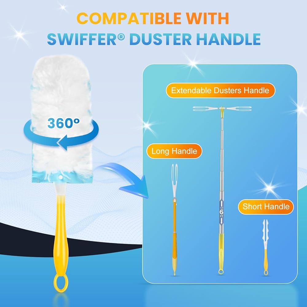 🏠【Compatible with Swiffer Handles】: Our 360°heavy duty duster refills are compatible with Swiffer all duster handle models, including short, retractable, extra long and upgraded. The universal plug-in design allows for a perfect fit and a secure hold no matter which handle you use. Kindly Notes: This product is not original refill, not the original parts.Use brand name or model designation for this product is made solely for purposes of demonstrating compatibility.