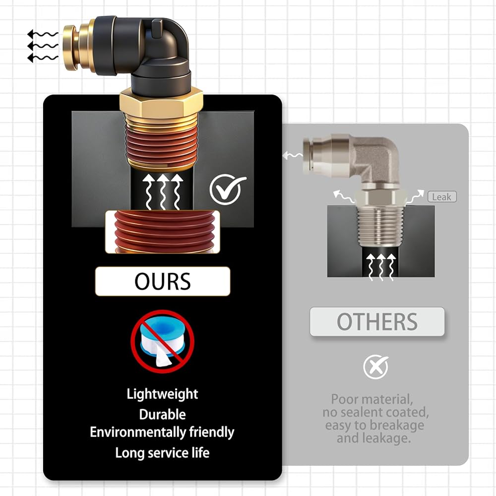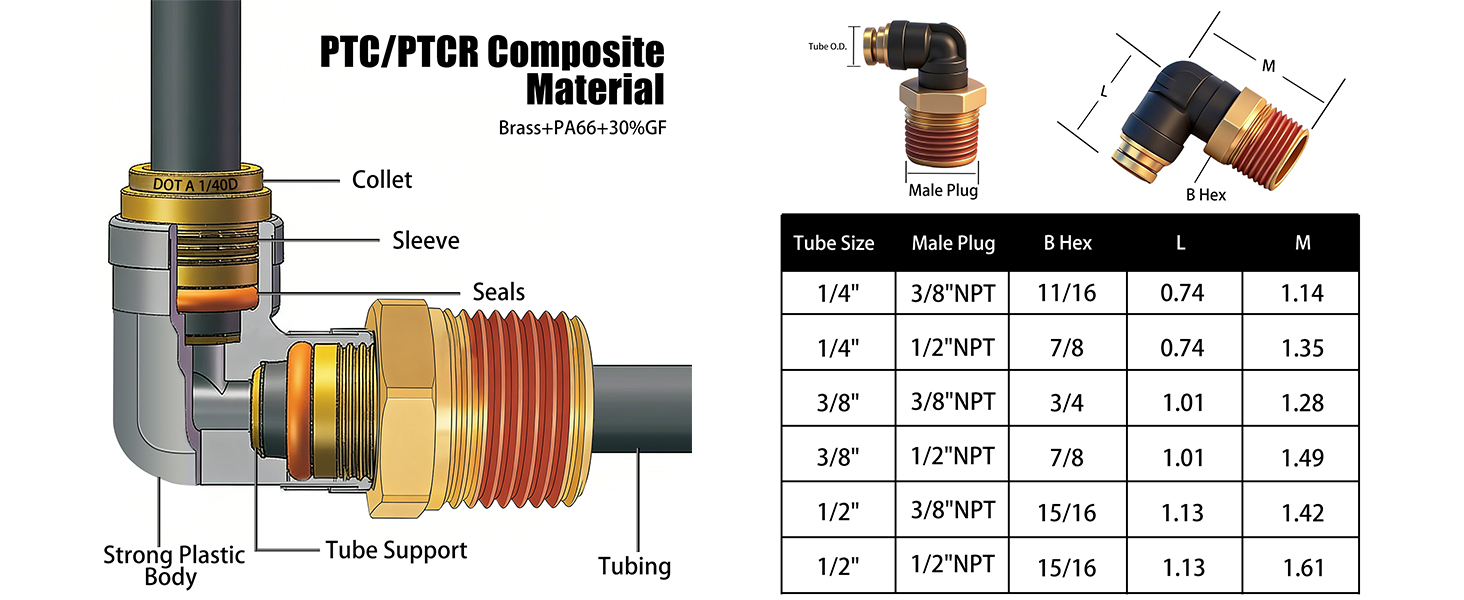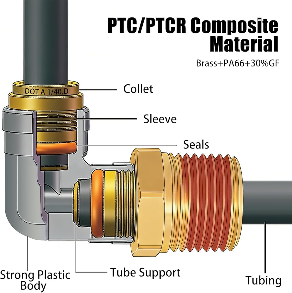هيكل متين وختم موثوق: مصنوع من البلاستيك الهندسي عالي الجودة (PTC/PTCR) والنحاس المصنوع بدقة، مما يوفر مقاومة ممتازة للتآكل وقوة ميكانيكية. يخضع كل تركيب لاختبارات صارمة لضيق الهواء قبل مغادرة المصنع، مما يضمن إحكامًا فائقًا وأداء مانع للتسرب في درجات الحرارة القصوى التي تتراوح من -40 درجة فهرنهايت إلى +200 درجة فهرنهايت (-40 درجة مئوية إلى +93.3 درجة مئوية).
