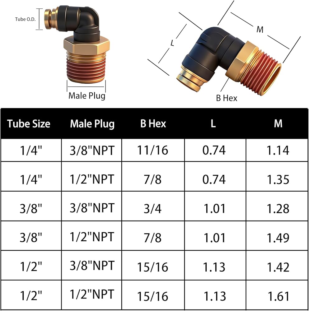 مواصفات واضحة، جاهزة للاستخدام: تتضمن العبوة قطعتين من تركيبات التوصيل السريع بمقاس 1/2 بوصة بزاوية 90 درجة. المواصفات: القطر الخارجي للأنبوب 1/2 بوصة وخيط NPT 1/2 بوصة. يرجى التحقق من نوع الأنبوب والمنفذ قبل الشراء؛ تعتبر هذه التركيبات خيارًا ممتازًا لإصلاحات أو ترقيات نظامك الهوائي
